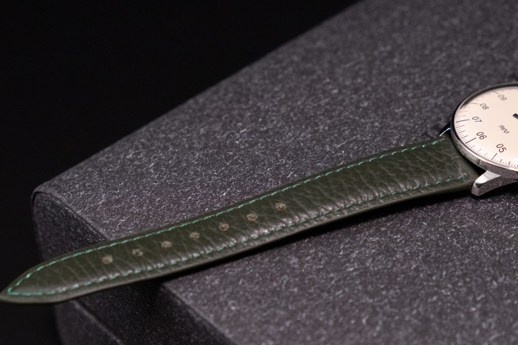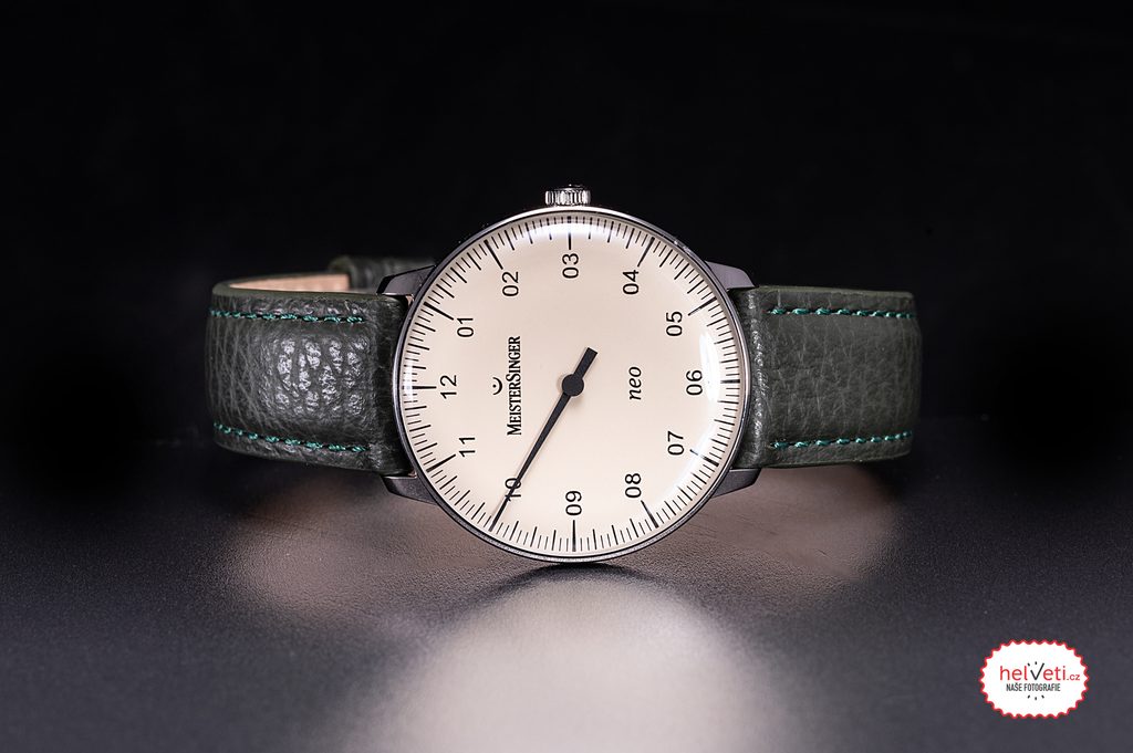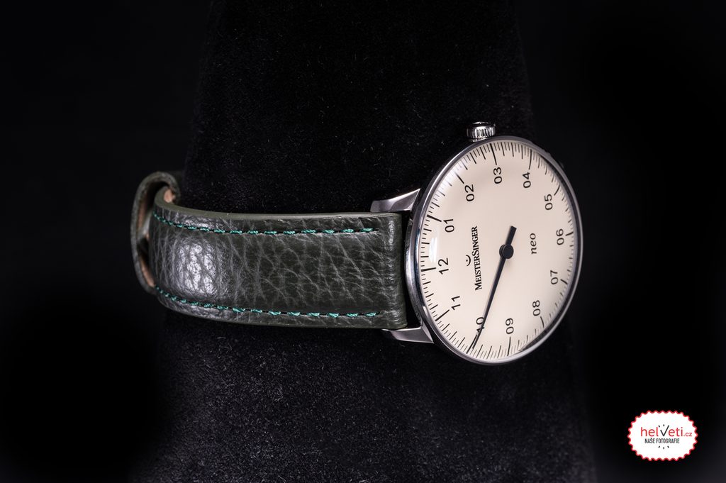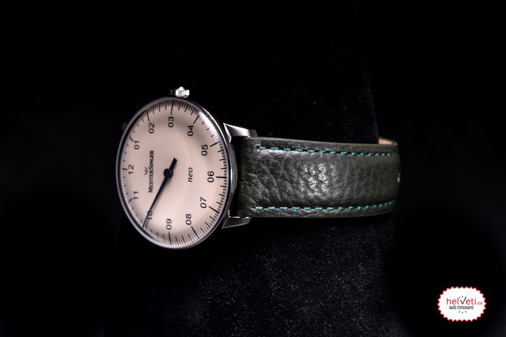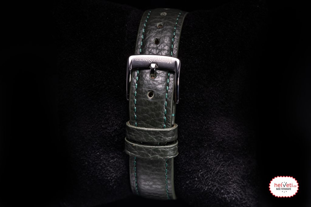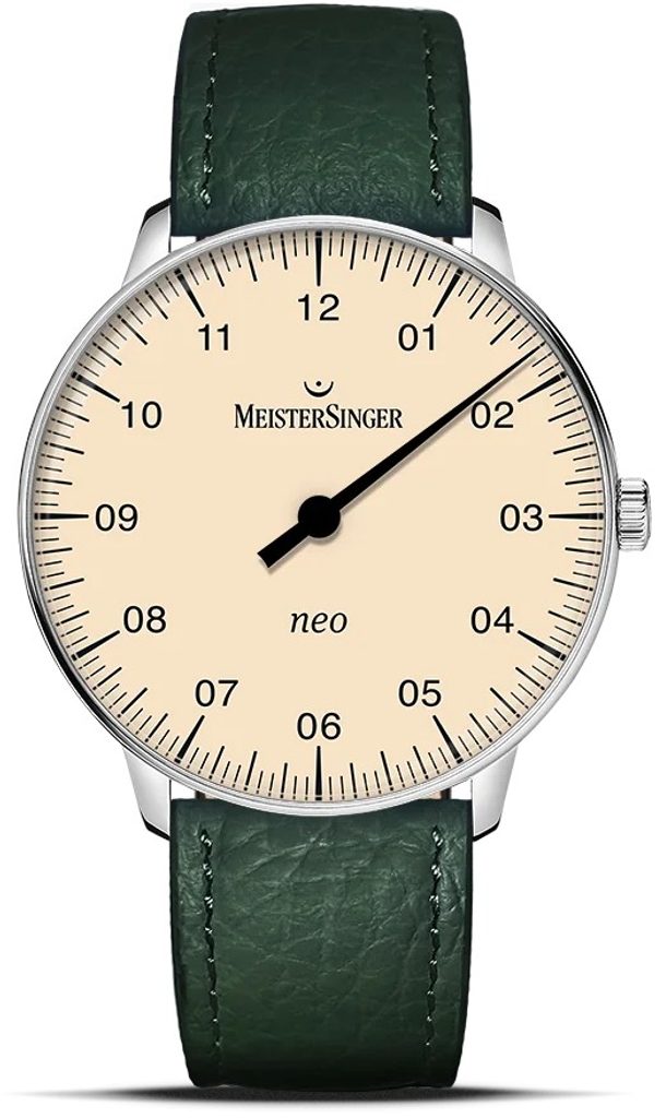 The whole look of the watch is inspired by models from the 1950s and 1960s. The case of the MeisterSinger Neo NES903 is made of stainless steel and is complemented by a green leather strap with a fine texture. Optionally, the MS Neo NES903 can also be purchased in combination with a brown suede leather strap or a mesh - fine knitted metal bracelet.