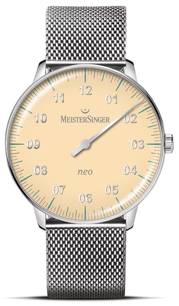 The 36 mm diameter case of the MeisterSinger Neo Special is made of stainless steel. The light yellow dial has a slight retro touch, complemented by the silver-glossy indices. These are printed in multiple layers, giving them a subtle three-dimensional effect. The needle-shaped hour hand also glistens in silver. Depending on the light, the watch takes on a unique elegance that changes with the angle of view. The hour and half-hour markers are designed in a contrasting colour that matches the dial and adds subtle accents.