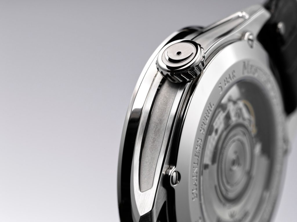 The 40.5 mm case is made of stainless steel in a combination of polished and brushed finishes. The milled sides of the case with deep recesses are an interesting detail. Also worthy of note is the newly designed crown reflecting the perfect symmetry of the case.