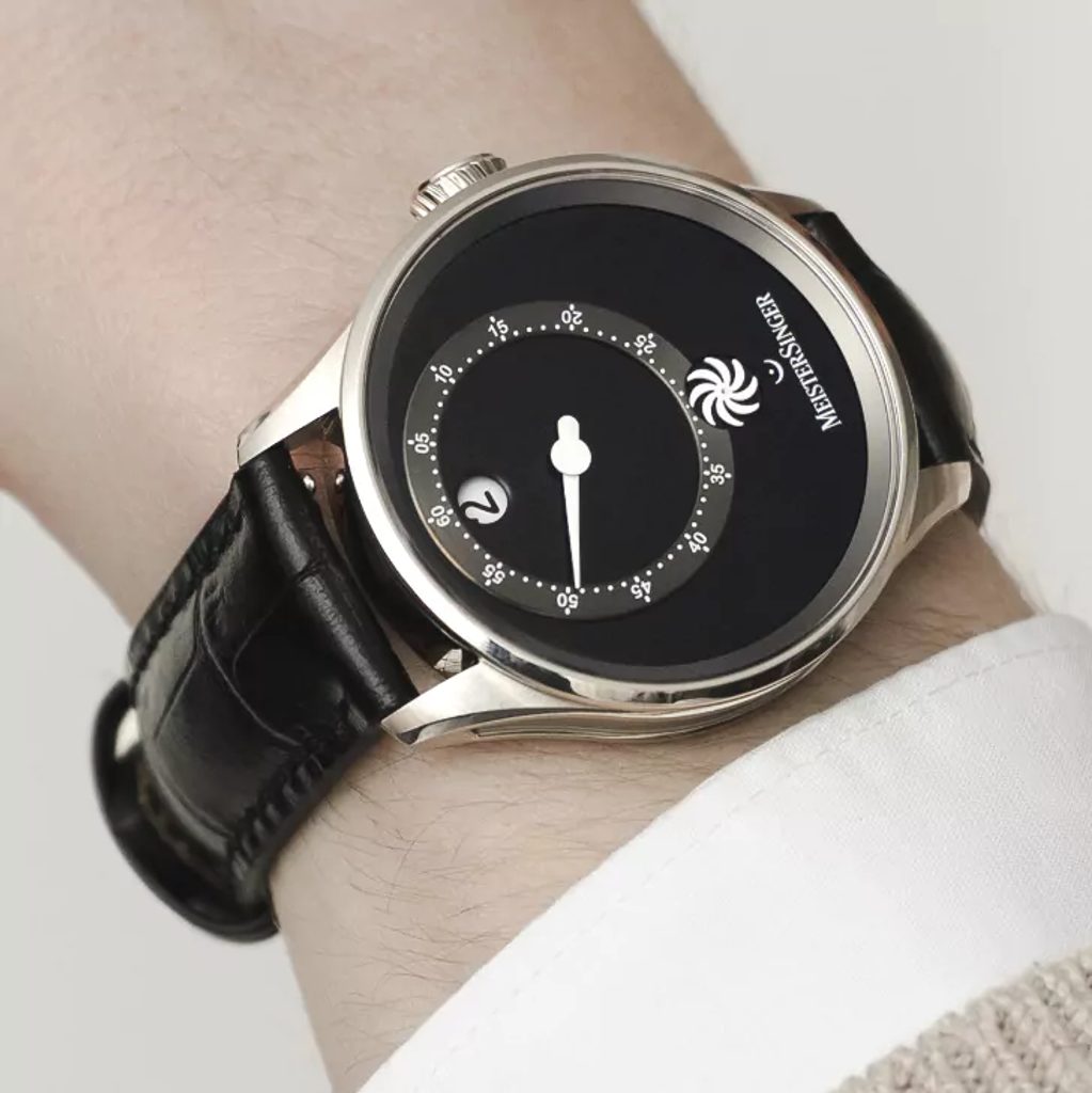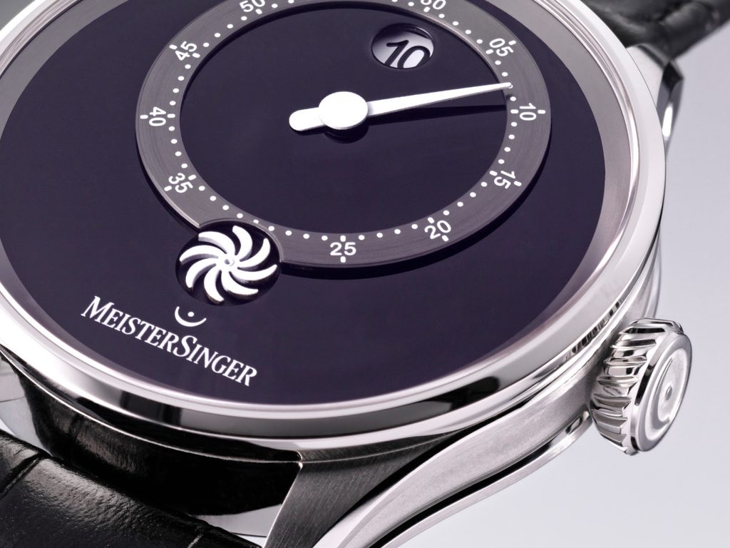 The main feature of the watch, however, is the simple but very impressive black dial, which embodies style and elegance. It is set in an extremely narrow bezel. On the dial, which displays the time in a minimalist, calm and completely intuitive way, there is an off-centre hand that measures the elapsed minutes. The hours appear in a perfectly round window at the 12 o'clock position, where the numerals change with absolute precision, hour by hour. Then, below the logo, we find the gently rotating MeisterSinger Sun Wheel - a subtle running indicator that replaces the seconds hand and confirms that the movement is in operation without disturbing the purity and harmony of the dial. This newly conceived geometry gives the dial a remarkable sense of depth, dynamic tension and its own unique sense of order.