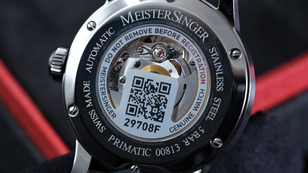 The 41.5 mm case of the Primatic 365 is made of stainless steel and inside it ticks a Swiss automatic movement, the Sellita SW270, which is specially adapted for MeisterSinger single-hand watches. The movement gives the watch a power reserve of 38 hours, and the power reserve indicator also alerts you when the watch needs to be rewound. Its work can be observed thanks to the transparent dial.
