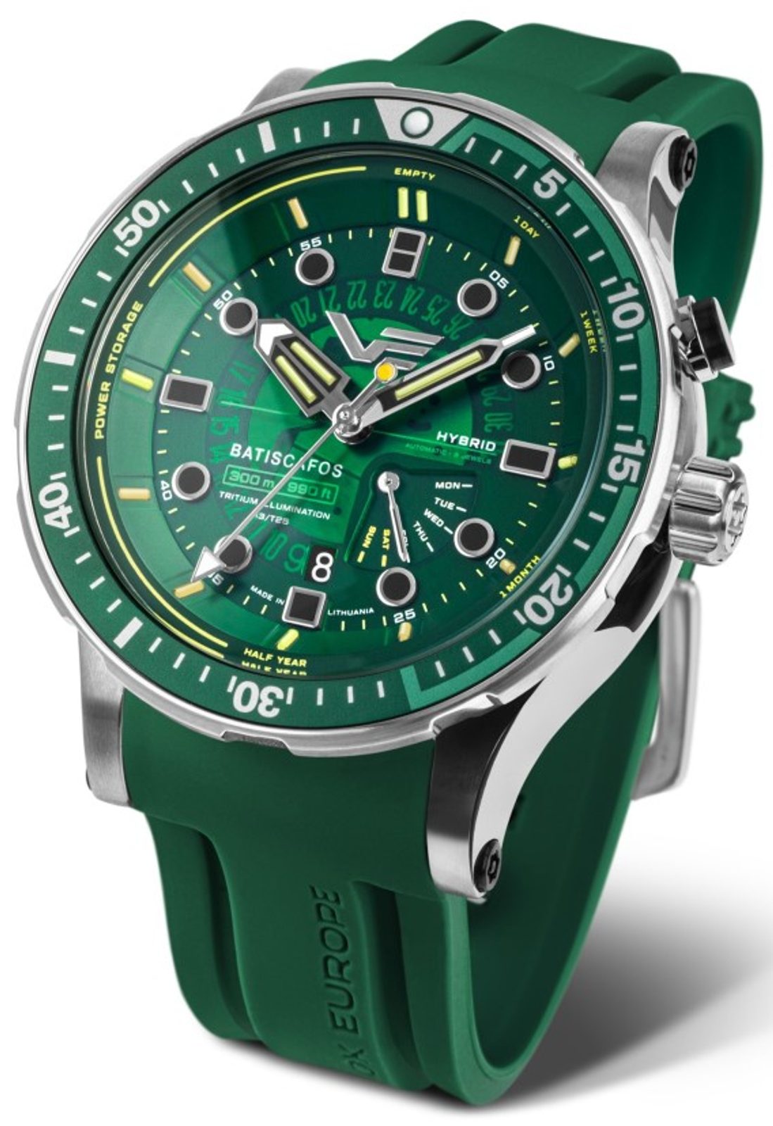 The Batiscafos (from the Greek words “bathys” (deep) and “skaphos” (ship)) collection brings a new chapter in VE dive watch evolution - it merges classic dive-watch aesthetics with advanced technology. Its streamlined case and exhibition case back echo the silhouette of deep-sea vessels, complete with an “illuminator”.