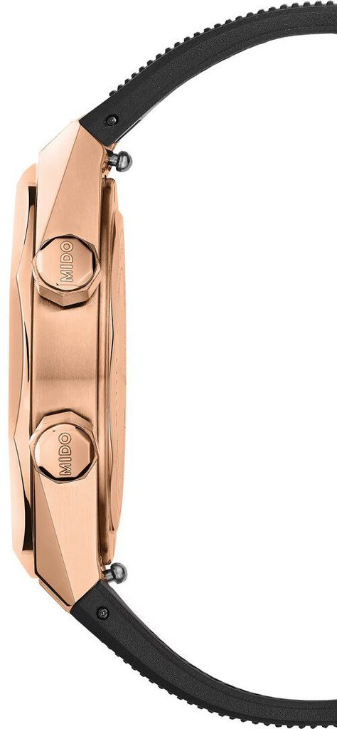 The Mido M047.507.37.051.00 watch has a case made of 316L stainless steel with a rose gold PVD finish and is complemented by an integrated rubber strap. The Swiss mechanical movement Mido Caliber 72 (based on the ETA A31.111) with automatic winding ticks reliably in the case. It operates at a frequency of 25,200 semi-frequencies per hour, has 21 jewels and, above all, an extended power reserve of 72 hours. The operation of this machine can be observed through the transparent dial. At the 3 o'clock position we find a practical date display. An internal rotating lunette, operated by the crown at the 2 o'clock position, is used to measure time periods.
