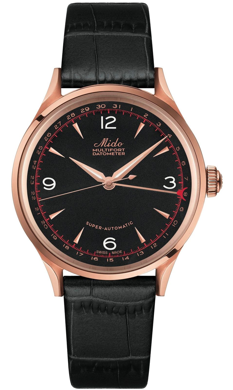 The Swiss Mido Multifort Datometr Automatic Gold Limited Edition 100PCS M902.407.76.057.00 will win its owners over with its elegant retro look, rose gold case and precise workmanship. This makes it a great companion especially for everyday wear, but it will also serve well in company. This limited edition is made in just 100 pieces for the whole world and is a tribute to the famous model from the 1940s.