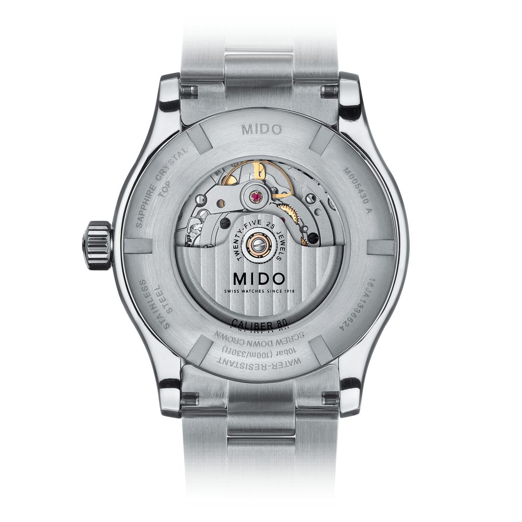 The Mido M005.430.11.031.80 watch has a case including the bracelet made of 316L stainless steel. In the case, the Swiss mechanical movement Mido Caliber 80 (based on ETA C07.621) with automatic winding ticks reliably. It operates at a frequency of 21,600 semi-frequencies per hour, has 25 jewels and, above all, an extended power reserve of 80 hours. The operation of this machine can be observed through a transparent die. At the 3 o'clock position we find a practical date and day of the week display.