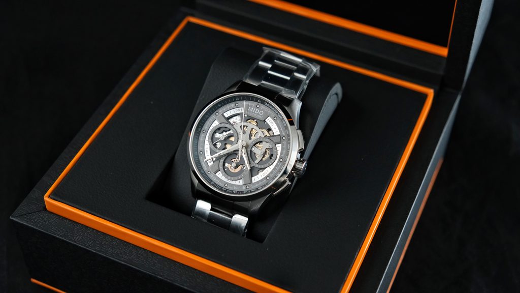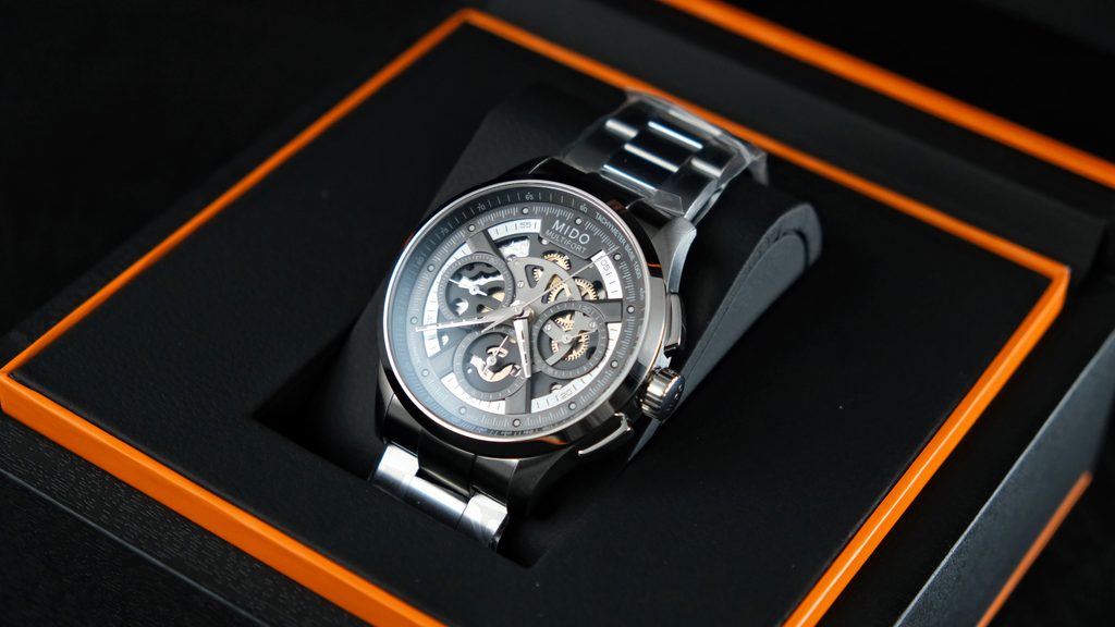 The Mido M038.662.11.060.00 watch has a case including the bracelet made of 316L stainless steel. The Swiss mechanical movement Mido Caliber 60 (based on the ETA A05.951 based on the Valjoux 7750 movement) with automatic winding ticks reliably in the case. It operates at a frequency of 28,800 semi-frequencies per hour, has 27 jewels and, above all, an extended power reserve of 60 hours. The movement's operation can be observed through the transparent dial and, thanks to the skeletonised dial, also through the front of the watch. A stopwatch can be used to measure periods of time. A tachymetric scale can be found around the perimeter of the dial, which is used to measure the average speed over a precisely defined period.