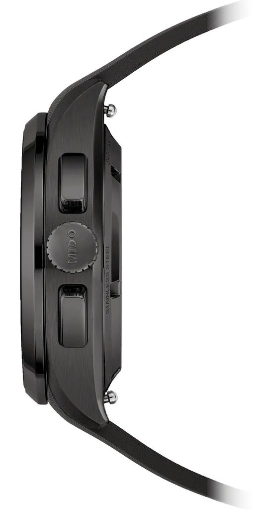 The Mido M038.662.37.050.00 has a case made of 316L stainless steel with PVD finish and is complemented by a rubber strap. The case reliably ticks the Swiss mechanical movement Mido Caliber 60 (based on the ETA A05.951 which is based on the Valjoux 7750 movement) with automatic winding. It operates at a frequency of 28,800 semi-frequencies per hour, has 27 jewels and, above all, an extended power reserve of 60 hours. The movement's operation can be observed through the transparent dial and, thanks to the skeletonised dial, also through the front of the watch. A stopwatch can be used to measure periods of time. A tachymetric scale can be found around the perimeter of the dial, which is used to measure the average speed over a precisely defined period.