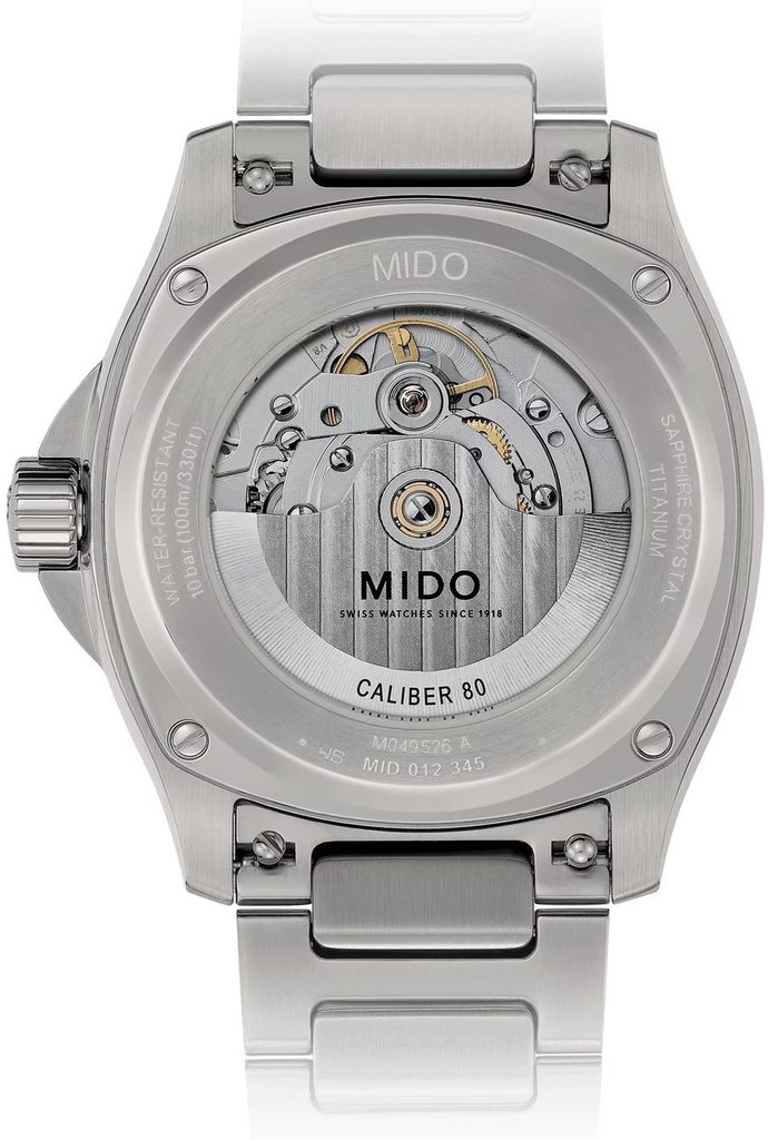 The Mido M049.526.44.081.00 has a case including the bracelet made of titanium, which results in its light weight and complete anti-allergy properties. The bracelet is fitted with quick-release clasps and is therefore easy to change without the aid of tools. The Swiss mechanical movement Caliber 80 Big Date (based on ETA C07.651) with automatic winding ticks reliably in the case. It operates at a frequency of 21,600 semi-frequencies per hour, has 25 jewels and, above all, an extended power reserve of 80 hours. The operation of this machine can be observed through the transparent dial. At the 12 o'clock position, we find a practical large date indicator - the so-called Big Date.