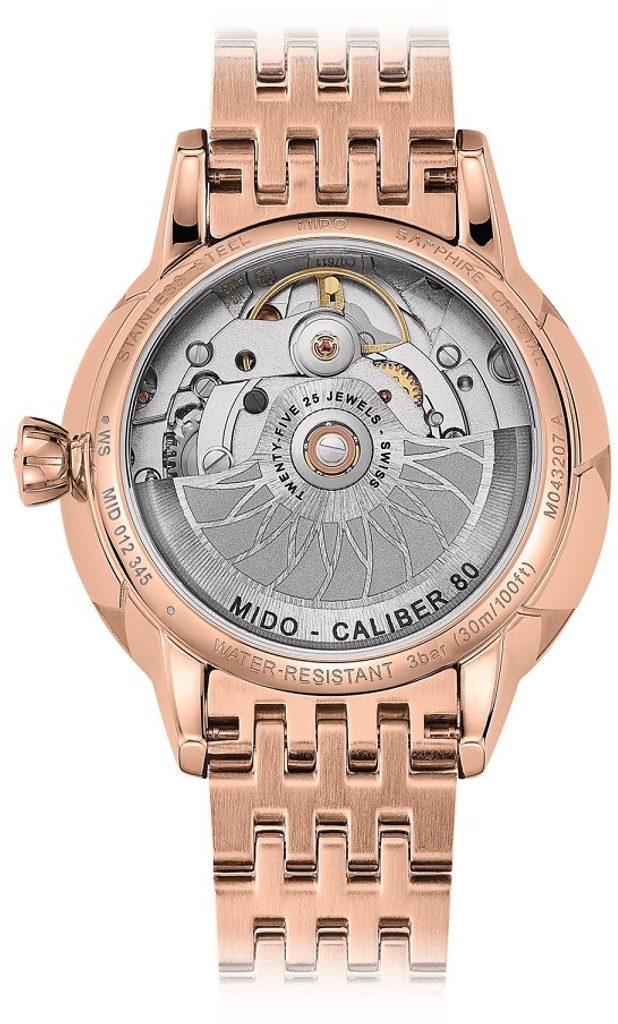 The Mido M043.207.33.106.00 watch has a case and bracelet made of 316L stainless steel with a rose gold PVD finish. Inside it, the Mido Caliber 80 Swiss mechanical movement (based on the ETA C07.611) with automatic winding ticks reliably. It operates at a frequency of 21,600 semi-frequencies per hour, has 25 jewels and, above all, an extended power reserve of 80 hours. The operation of this machine can be observed through a transparent die. At the 6 o'clock position we find a practical date display.