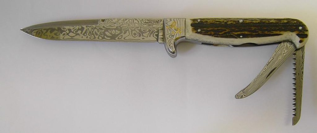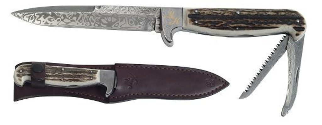 Thedagger with a damascus blade belongs to the luxury knives made only to order. The blade of the dagger is made of a unique damascus steel PMC27 with a hardness of 57-60HRc, and thanks to its internal structure it boasts not only remarkable toughness and durability, but also a unique design. The dagger shaft is made of genuine deer antler. In addition, the dagger is equipped with a high-quality saw and a toothpick, thanks to which it will find its application both when hunting and as a camping helper.