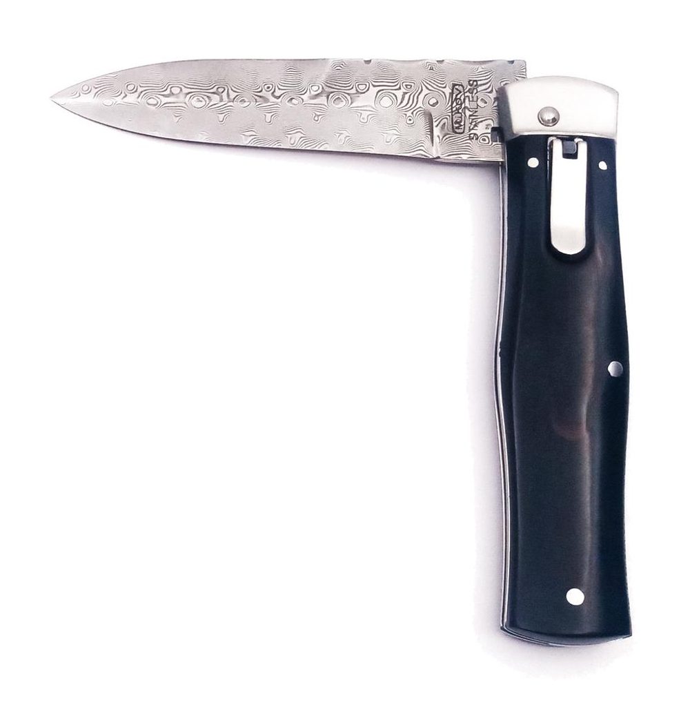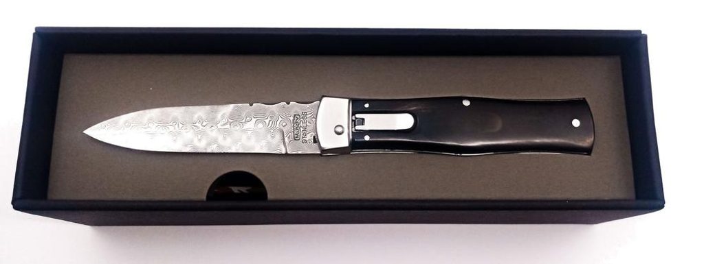 Predator is an automatic throwing knife boasting original design and luxurious materials. The blade of the knife is made of damascus stainless steel PMC 27 with a hardness of 57-60 HRc, which is the most valued material for the production of blades. The ornate back pen and the elegant genuine buffalo horn sheath, which thanks to its shape guarantees a firm and secure grip on the knife, also attract attention. The luxurious design of the knife goes hand in hand with its toughness and high durability.