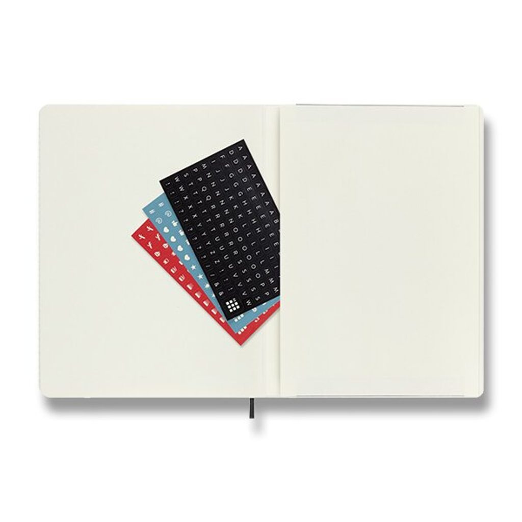 Thediary has a soft, spine-sewn binding in cardboard covers and is wrapped with elastic tape to prevent spontaneous opening. There is also a fabric bookmark, three sheets of coloured stickers, a leaflet with the history of MOLESKINE and a handy pocket. The paper weight is 70 g/m² and contains no acids.