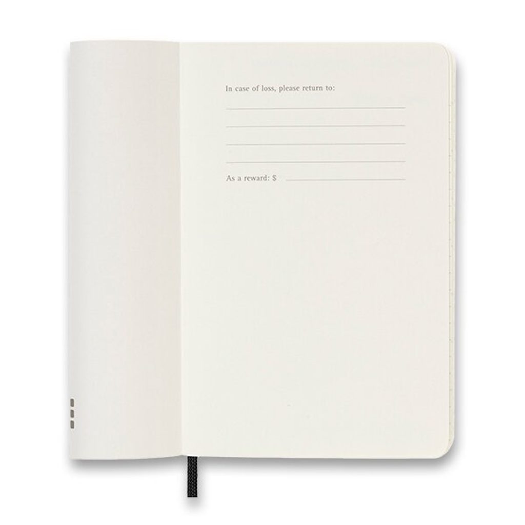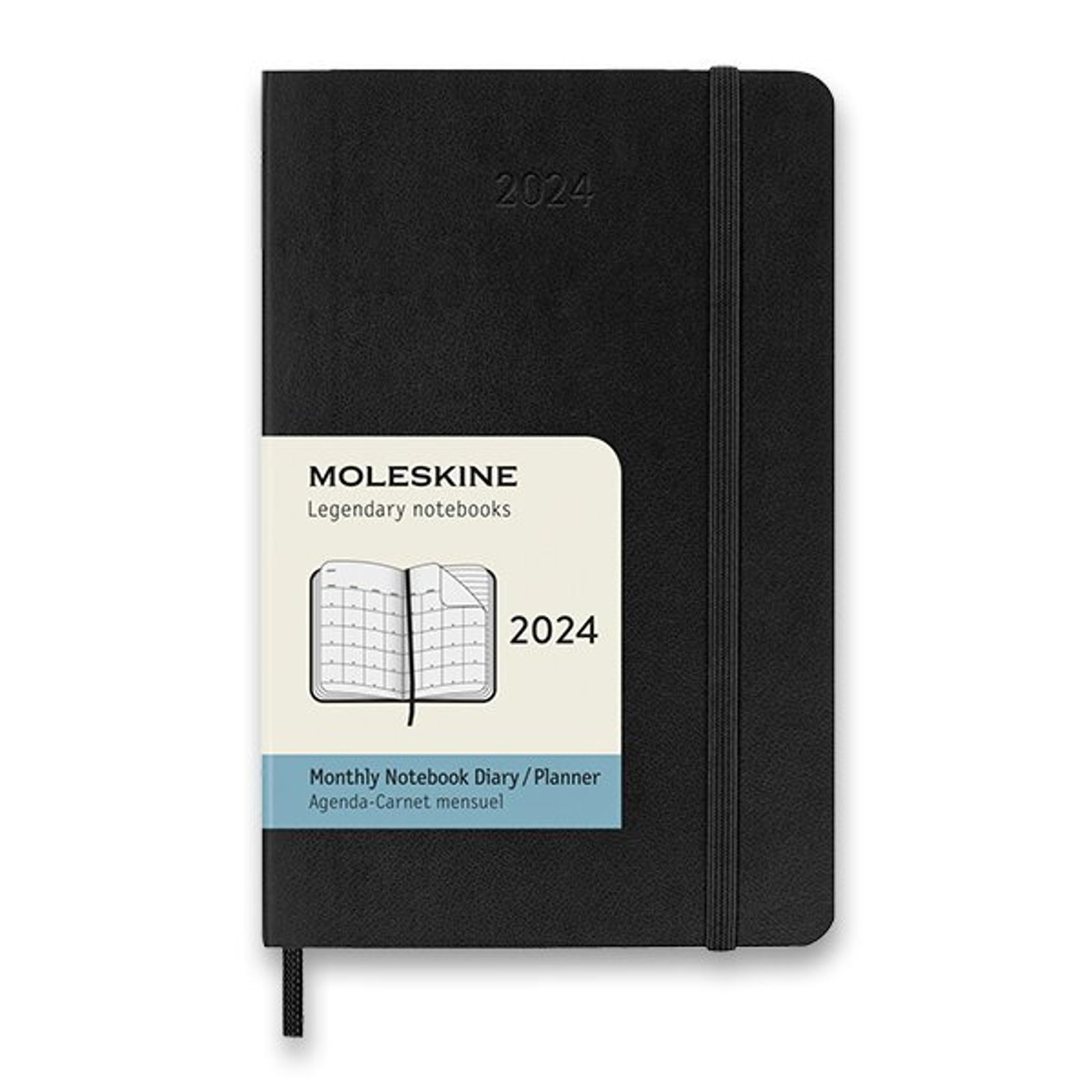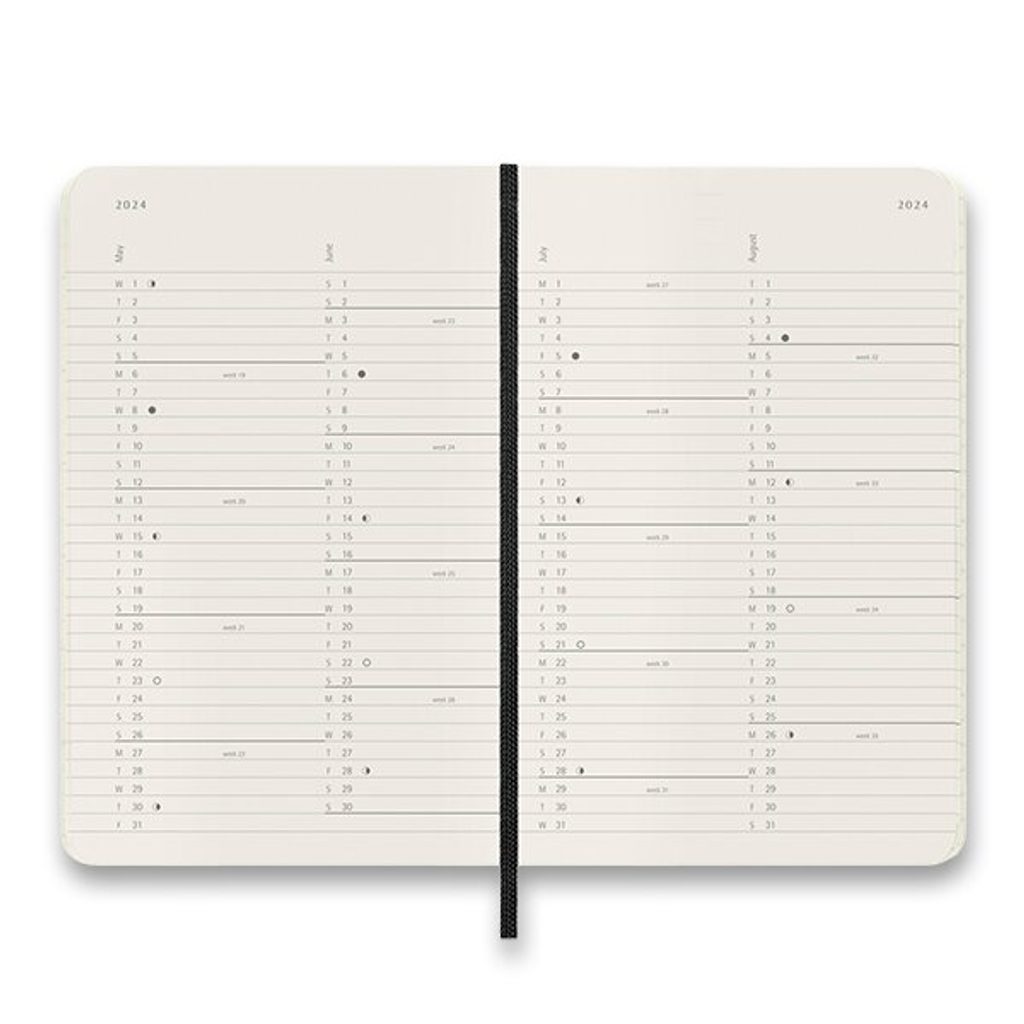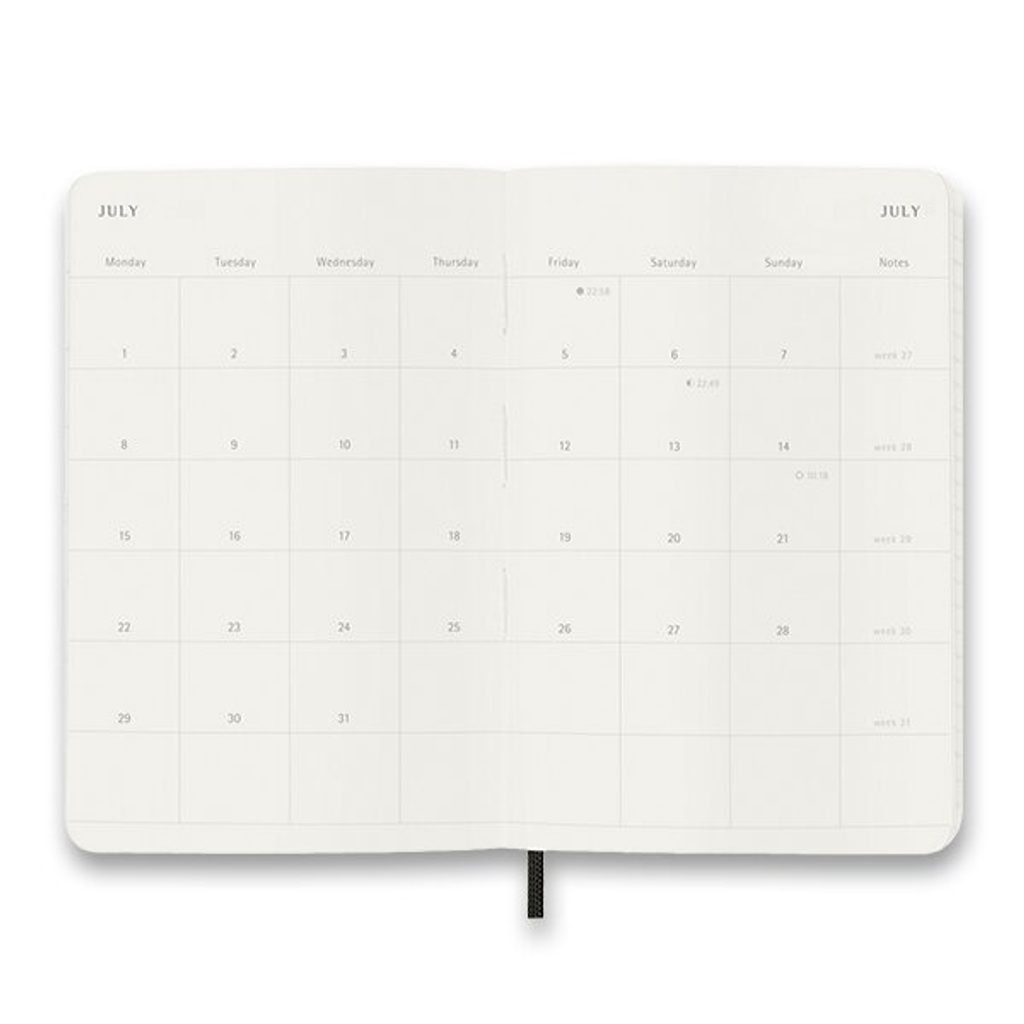 The month is shown on two pages, followed by two lined pages. At the end there are 51 pages for notes. The diary has a soft, spine-sewn binding in cardboard covers and is wrapped with elastic tape to prevent spontaneous opening. It also includes a handy inner pocket for business cards and documents, a fabric bookmark, 295 colour stickers and a leaflet with the history of Moleskine. The 70 g/m2 paper is also acid-free.