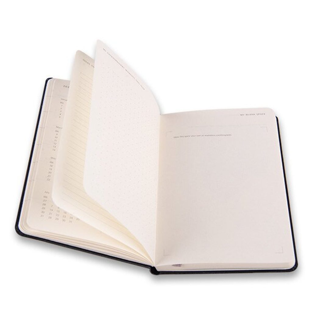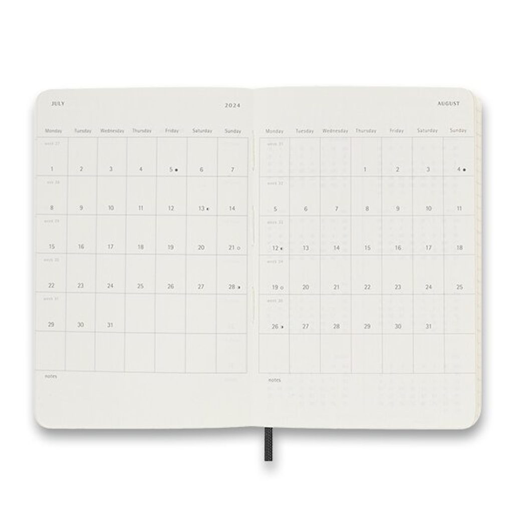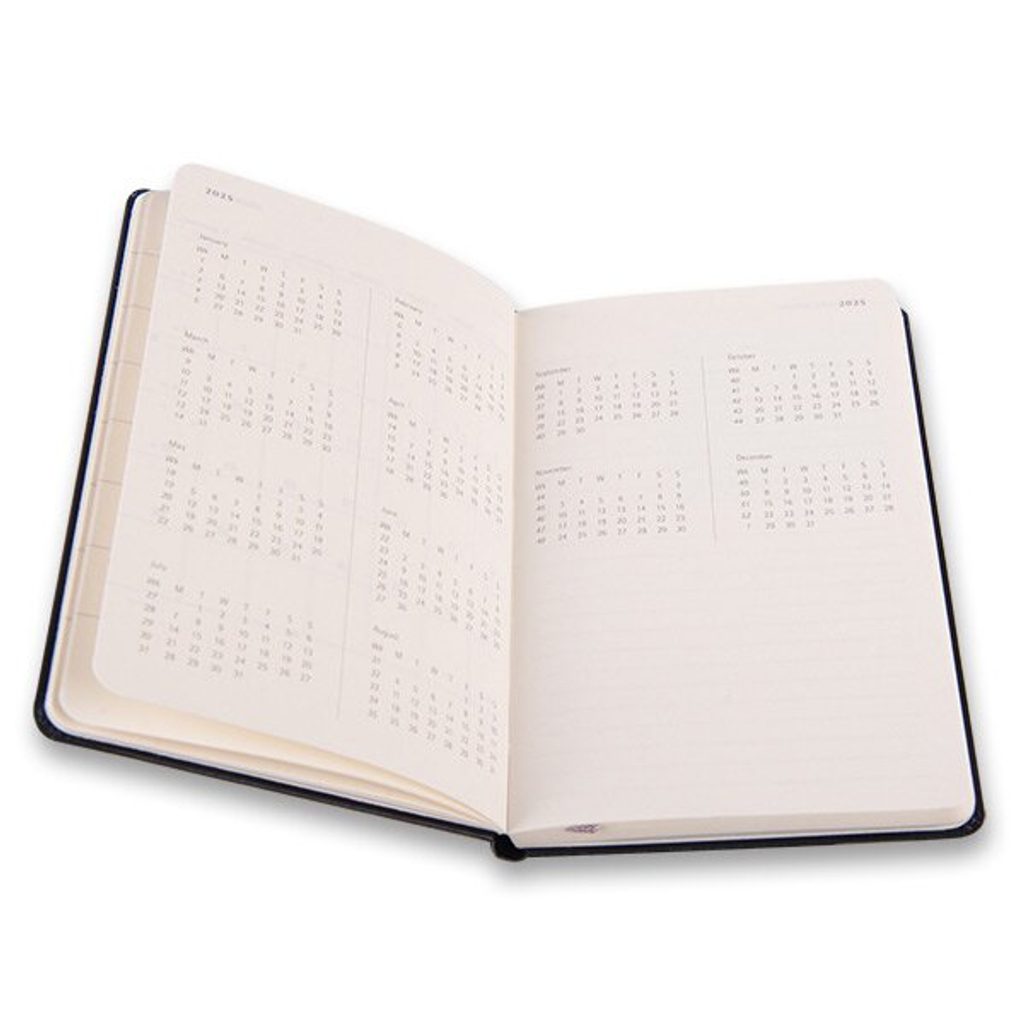 The left side shows the days of the week and the right lined side is for notes and tasks. The diary has a soft, spine-sewn binding in cardboard covers and is wrapped with elastic tape to prevent spontaneous opening. It also includes a handy inside pocket for business cards and documents, a fabric bookmark, 295 colour stickers and a leaflet with the history of Moleskine. The 70 g/m2 paper is also acid-free.