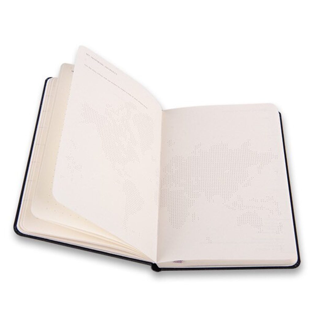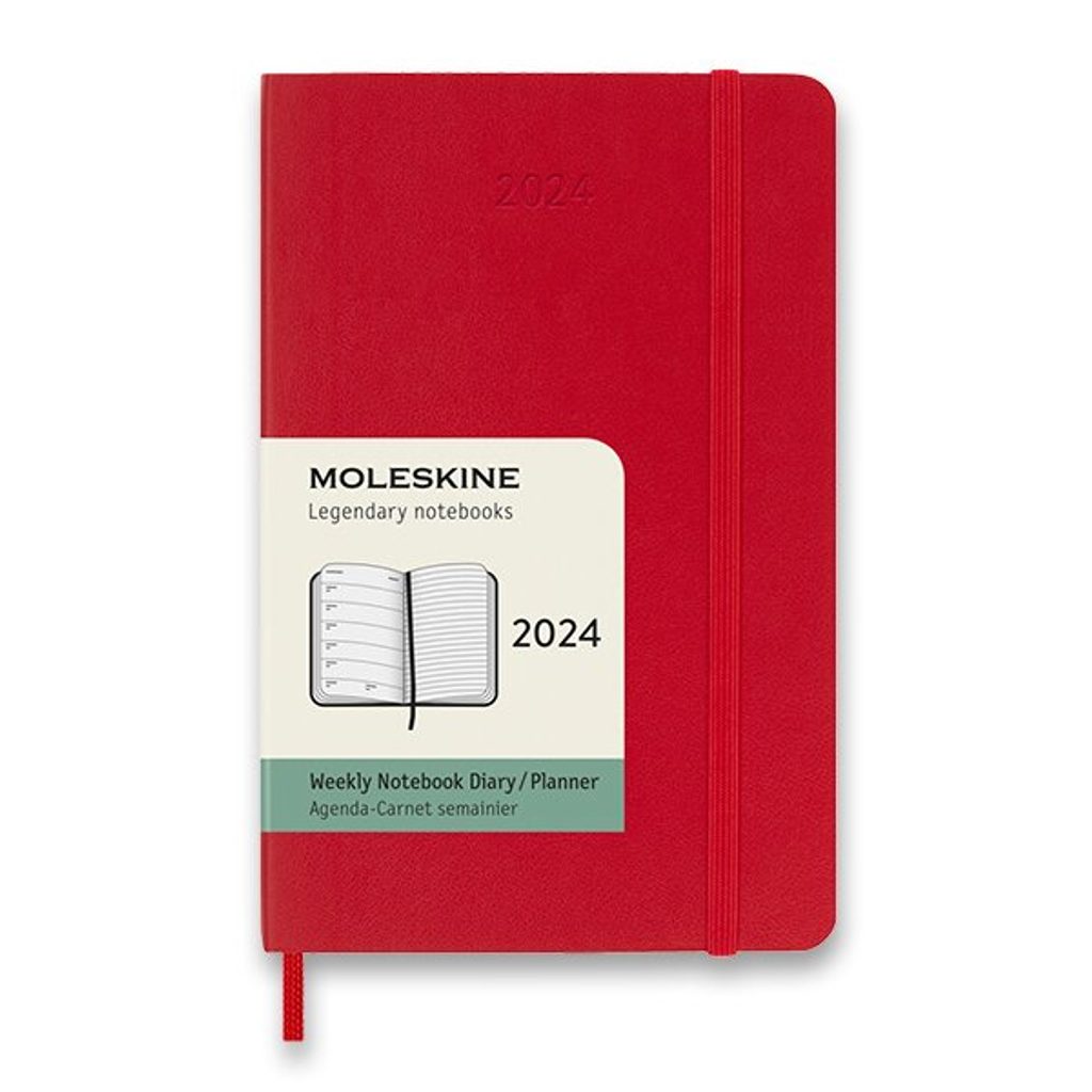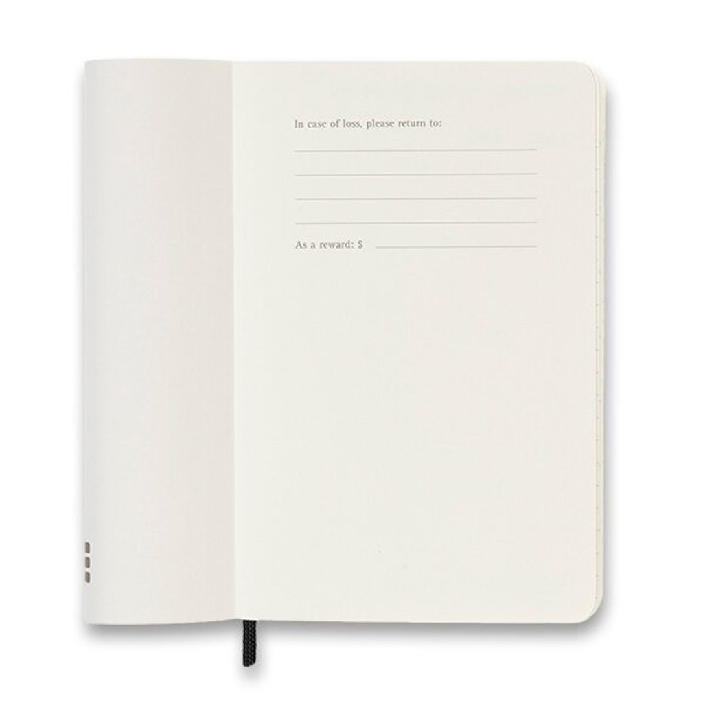 The left side shows the days of the week and the right lined side is for notes and tasks. The diary has a soft, spine-sewn binding in cardboard covers and is wrapped with elastic tape to prevent spontaneous opening. It also includes a handy inside pocket for business cards and documents, a fabric bookmark, 295 colour stickers and a leaflet with the history of Moleskine. The 70 g/m2 paper is also acid-free.