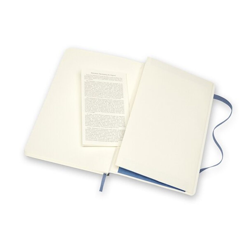 The notebook has a soft, sewn binding in cardboard covers at the spine, is encased in elasticated tape to prevent it from opening by itself, and also features a pocket for business cards and small items, which is made from fabric and cardboard. Inside you will find a handy fabric bookmark and a leaflet with the history of MOLESKINE. The paper weight is 100 gsm and contains no acids.