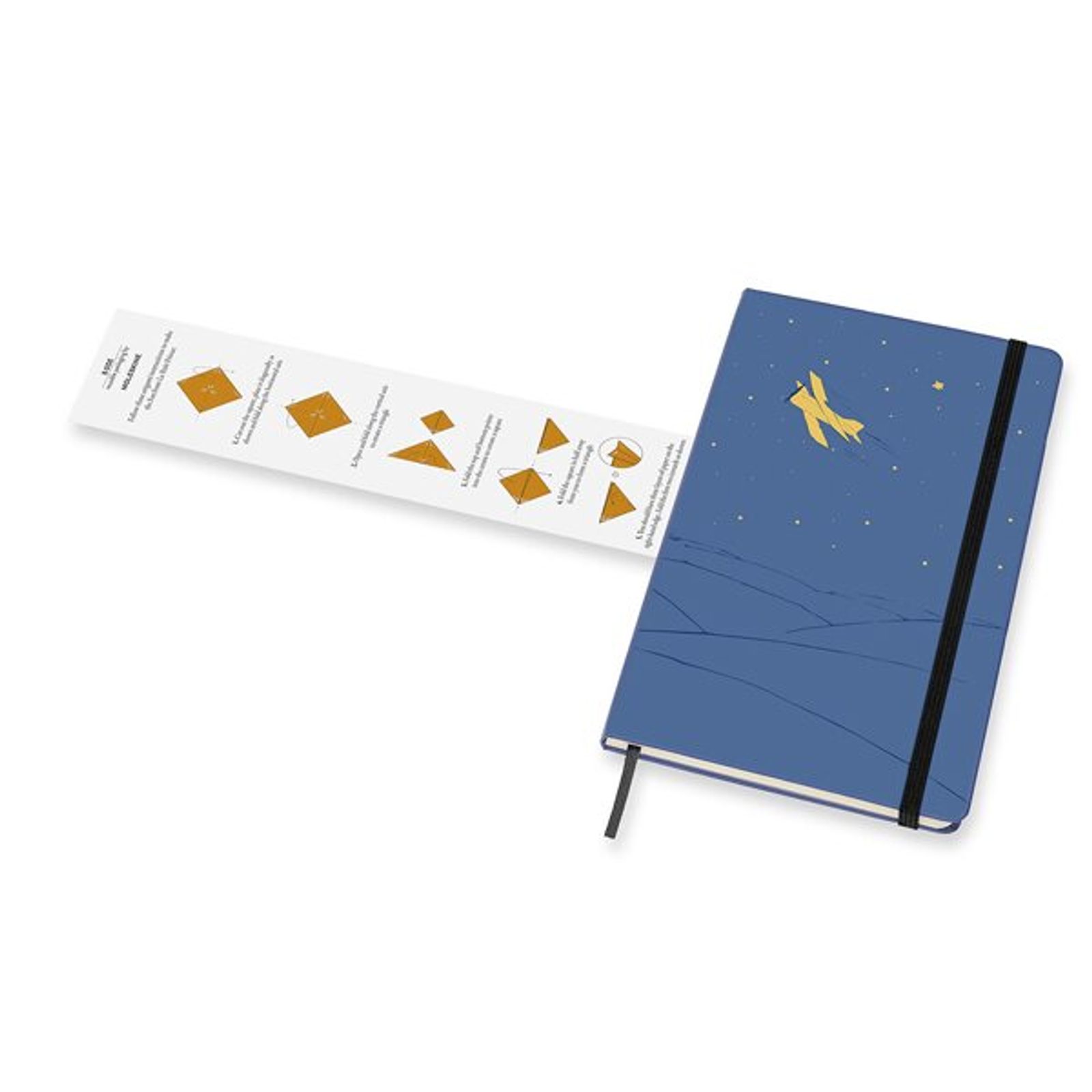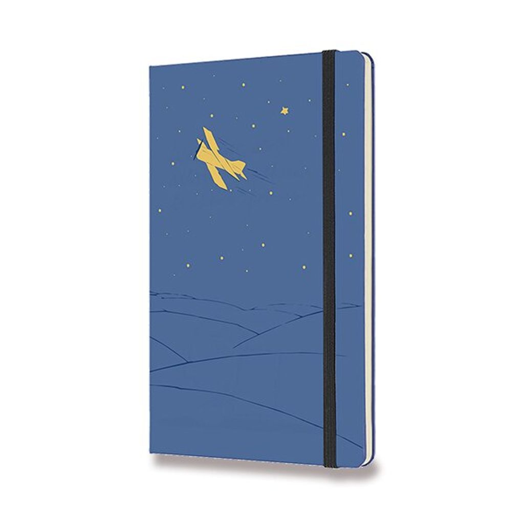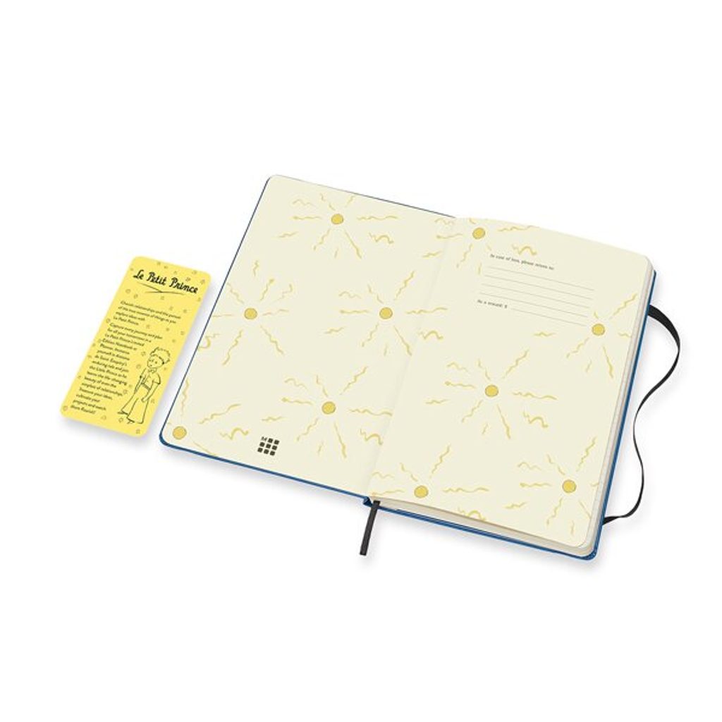 Moleskine 's limited-edition notebook featuring the fictional character Le Petit Prince by French author Antoine de Saint-Exupéry boasts a hardcover, spine-sewn binding in Moleskine-branded cardboard boards and is encased in elasticated tape to prevent spontaneous opening. In addition, it features a pocket for business cards and small items, which is made of fabric and cardboard. Inside the notebook you will also find a fabric bookmark and a leaflet with the history of MOLESKINE.
