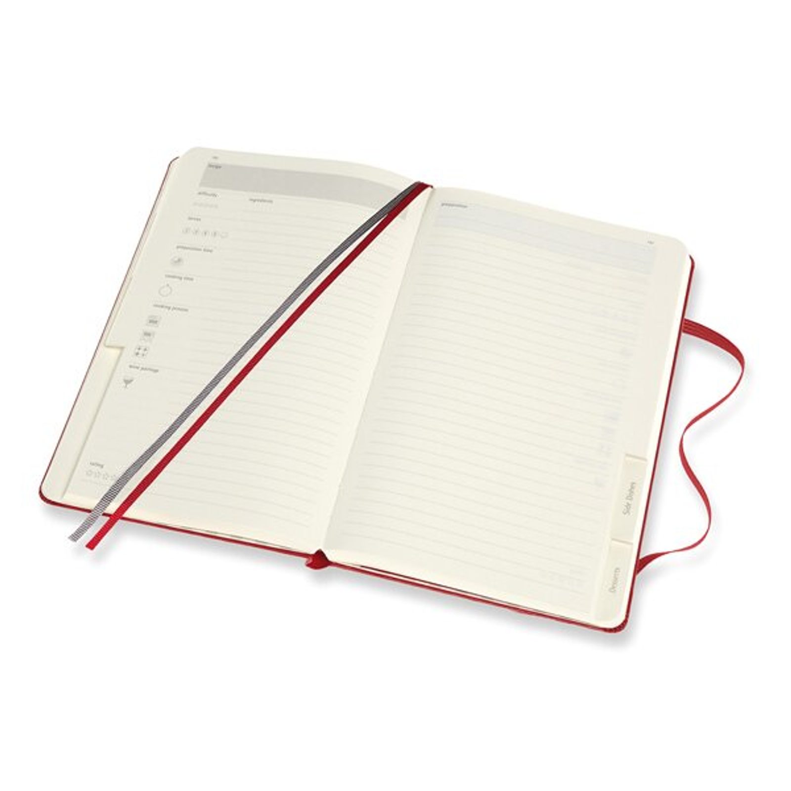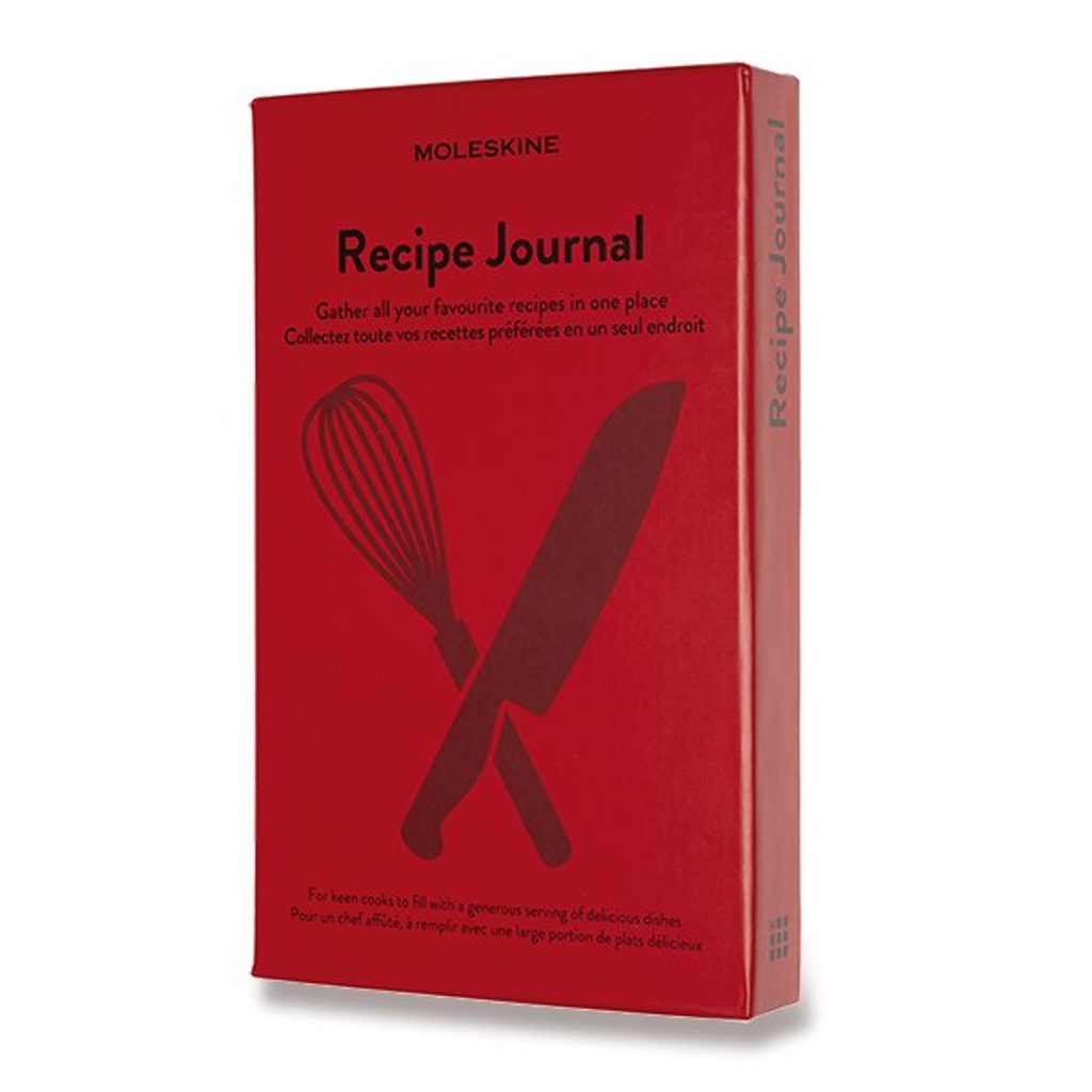 Moleskine 's handy notebook for recording recipes features a sturdy, spine-sewn binding in cardboard covers with embossed decoration. It is surrounded by an elastic band to prevent spontaneous opening and also features 2 fabric tabs, a double inner pocket, colourful stickers and a leaflet with the history of MOLESKINE. The notebook is divided into 6 thematic sections with a specific page layout (starters, first courses, main courses, side dishes, desserts, cocktails) and also contains information for proper cooking (food list, nutritional values, cooking methods, meat temperatures, unit conversion, etc.)