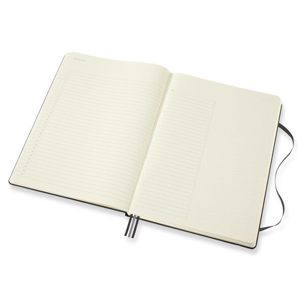 It combines the advantages of a diary with those of a notebook. It has a sturdy, sewn spine binding in cardboard covers and is enclosed with elastic tape to prevent spontaneous opening. The notebook is divided into several sections. It includes pages for planning long-term goals, an undated planning section with annual, 4-month, monthly, and weekly reviews, pages for writing activities to meet project goals, and structured pages for notes and brainstorming. Also included are nested pages for tasks that can be removed and sticky labels to create different sections. In addition, the 70 gsm paper is acid-free.