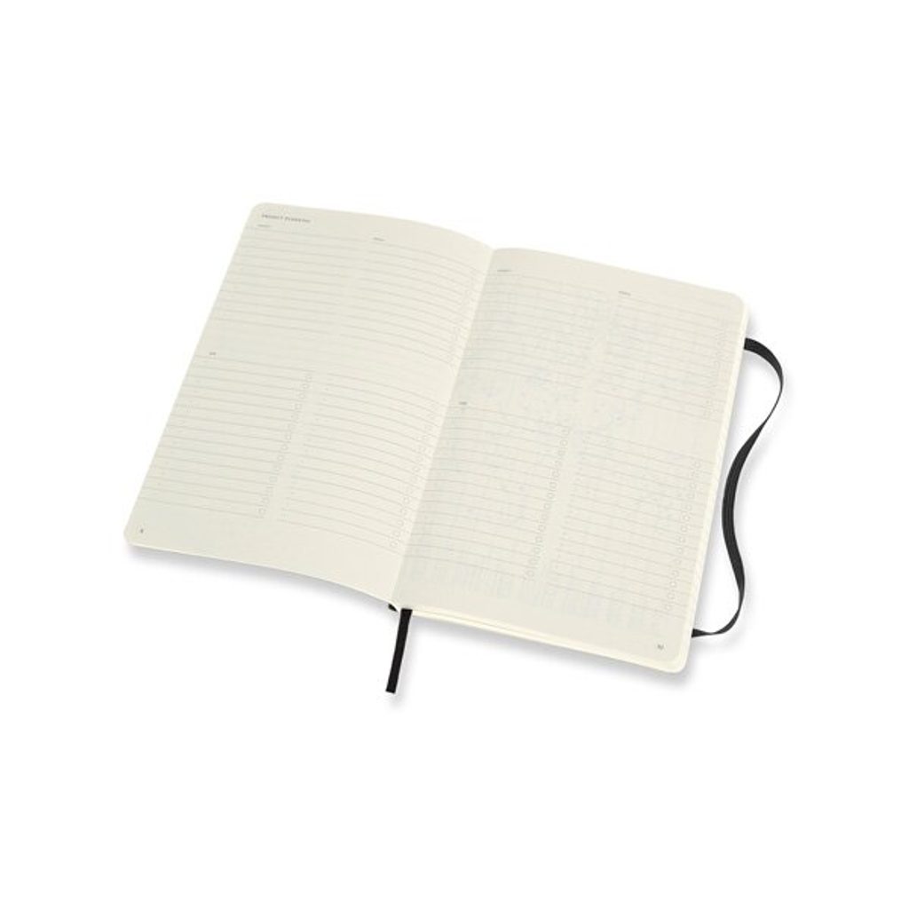 A practical Moleskine notebook designed for professionals, combining the advantages of a diary with those of a notebook. It has a soft, sewn binding in the spine in cardboard covers and is wrapped with elastic tape to prevent spontaneous opening. Each page is structured into three sections for convenient planning. The individual pages are numbered and the back matter contains an index for easy access to notes. There are also lined pages for tasks that can be easily removed, sticky labels and stickers for the folders. The paper weight is 70 gsm and contains no acids.