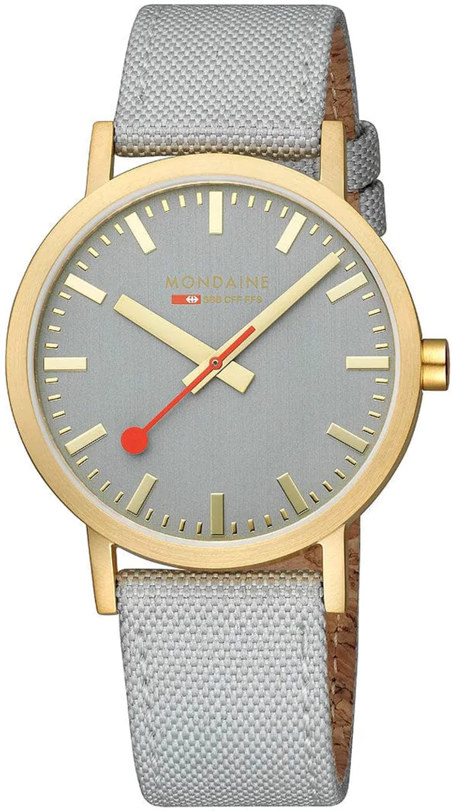 The 40 mmcase of the Mondaine A660.30360.80SBU is made of 316L stainless steel with a gold-coloured finish. It fits perfectly on the wrist thanks to the textile bracelet made from recycled PET bottles, which is fitted with a high-quality cork lining. The Classic collection also features a convenient quick-change bracelet system, so you can easily change the overall design of the watch. The uncomplicated and clear grey dial is protected by a mineral glass.