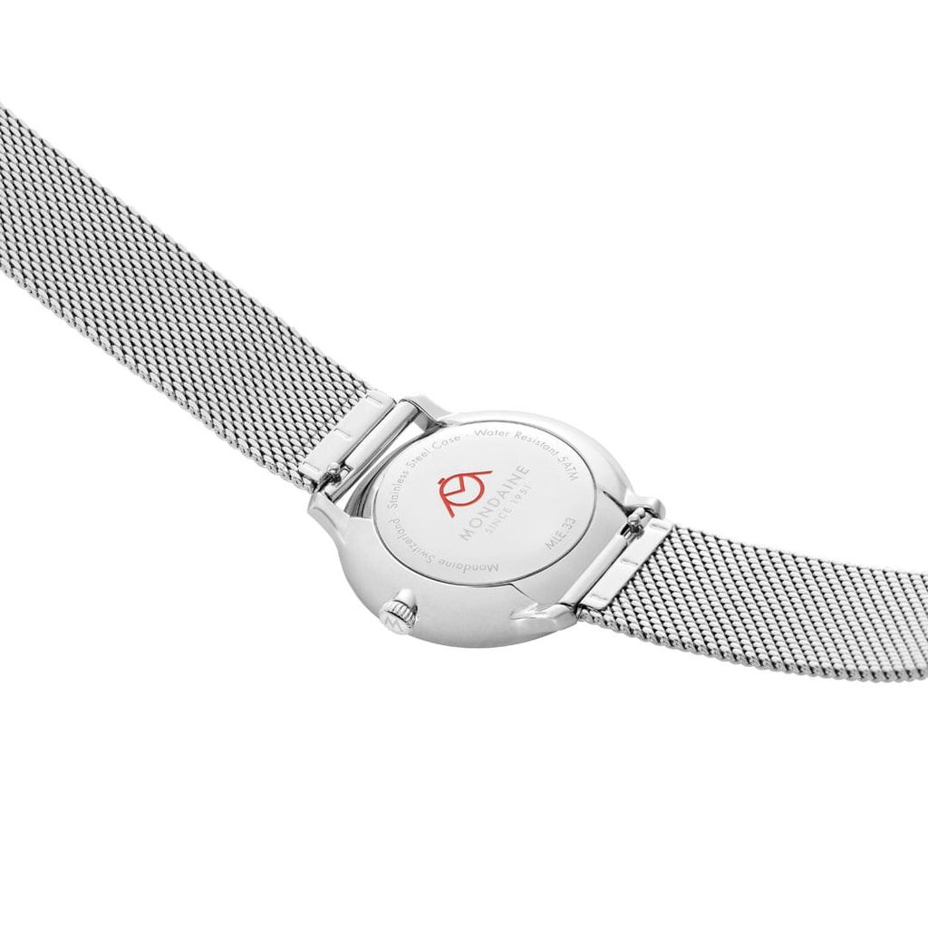 The case of the Mondaine MLE.33110.SM is made of stainless steel and the watch stays on your wrist thanks to the Milanese-style steel bracelet. The bracelet has a sliding snap clasp, which makes adjusting the size of the bracelet very easy even in home conditions.