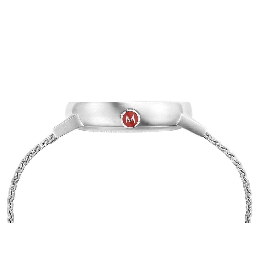 The case of the Mondaine MSE.40210.SM is made of stainless steel and the watch stays on the wrist thanks to the knitted "mesh" steel bracelet, whose size can be very easily adjusted thanks to the sliding clasp, even in home conditions.
