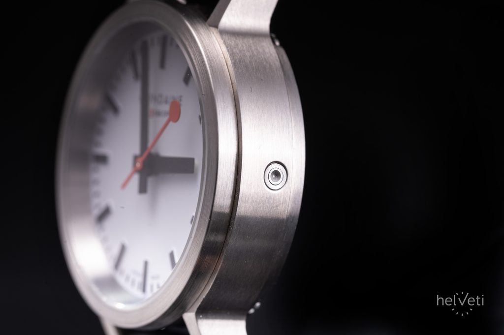 The very clear white dial is protected by a sapphire crystal with anti-reflective treatment. The unmistakable symbol for the Mondaine brand is the red seconds hand.