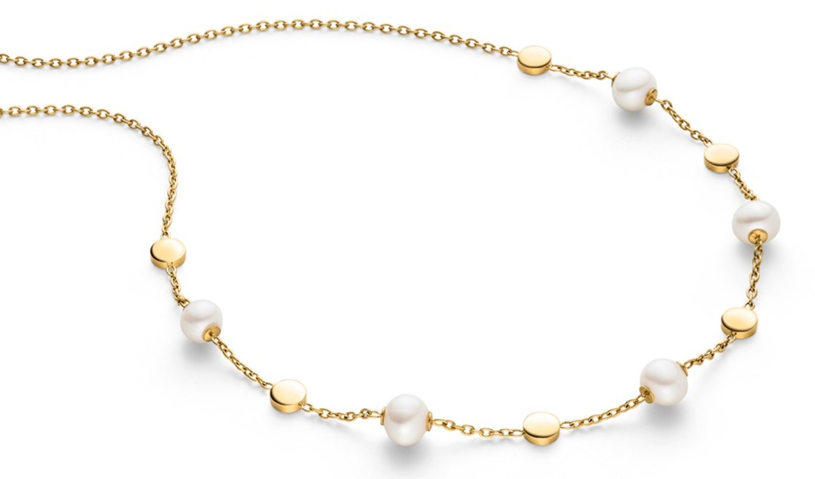 The delicate chain necklace in yellow gold plating is decorated with six tiny flats alternating with pearls.