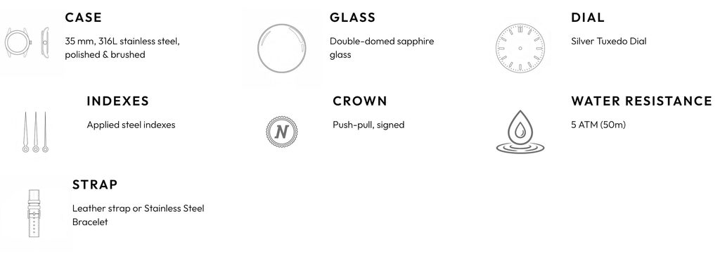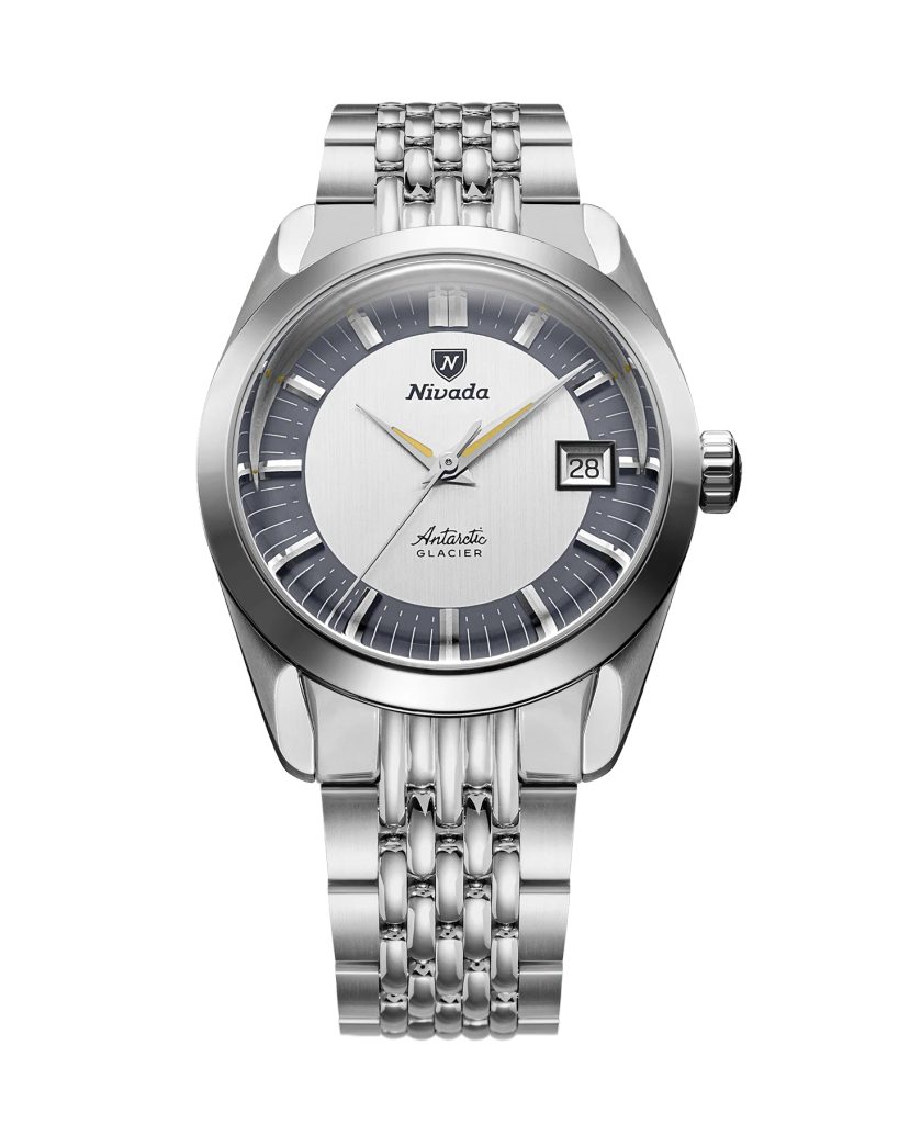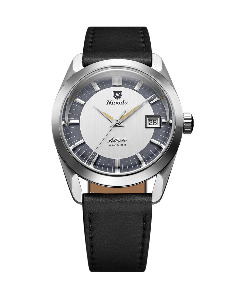 Inspired by the legendary Antarctic Glacier from the 1960s, the Antarctic Glacier 35mm with Tuxedo dial brings a modern reinterpretation of Nivada's polar legacy for today's adventurer. Its vertically cut two-tone dial in silver and anthracite, nicknamed Tuxedo for its refined contrast, features applied steel indices on the dark outer ring and impressive depth, contrast and luminescence.