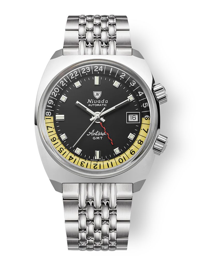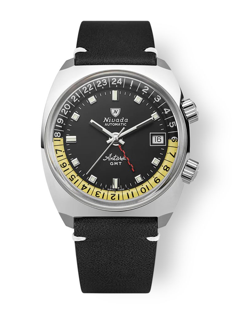 The Antarctic GMT is a tribute to the rich heritage of professional watchmaking by Nivada Grenchen. Originally introduced during the Jet Age, when frequent travelers required precise time zone tracking, the Antarctic GMT has been redesigned for modern adventurers. This retro-styled masterpiece pays homage to its 1970s roots while offering the contemporary functionality of the Swiss-made SOPROD C125 movement.