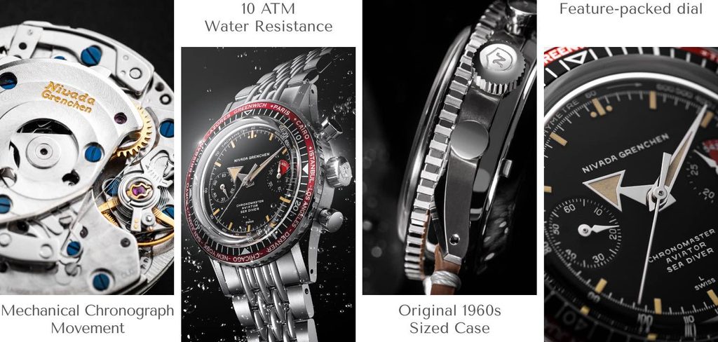 Nivada Grenchen, založená ve městě Grenchen ve Švýcarsku v roce 1926, je značka, která byla známá svými hodinářskými inovacemi v 50. a 60. letech s jejich legendárními kolekcemi Antarctic & Chronomaster Aviator Sea Diver. Dnes, téměř o století později, restartovali Nivadu Grenchen s cílem přivést zpět k životu dědictví a designy, které tehdy Nivadu vytvářely.