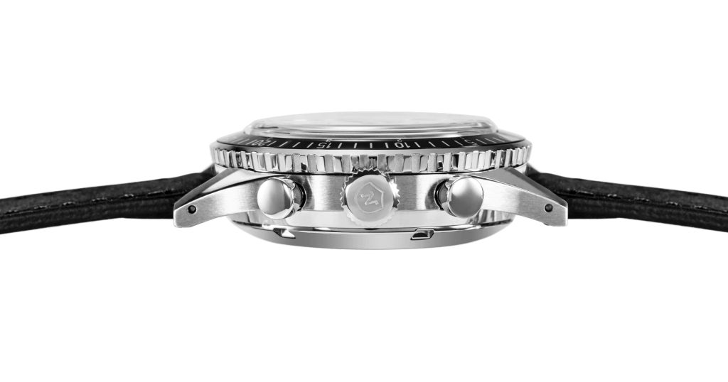 The watch is powered by a Landeron 70 movement with manual winding and a power reserve of 45 hours. The unique combination of dial and lunette offers some great features. In short, the Chronomaster is for the versatile man who needs a versatile watch. This is helped by the choice between a variety of strap options and also the water resistance of the model, which is 10 ATM.
