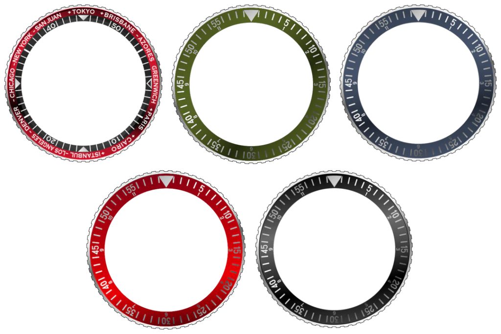 The watch comes with five interchangeable lunettes - black, red, green, blue and black and red.