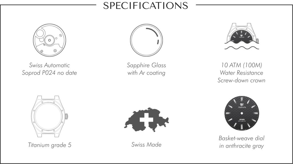 The 37 mm diameter, 12 mm thick grade 5 titanium case is treated to a polished and satin-brushed finish. Inside the model, the SOPROD P024 automatic movement operates with a power reserve of 38 hours. The entire watch is then protected by a high-quality double sapphire crystal, which guarantees maximum protection against scratches.