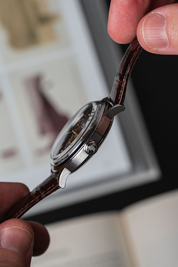 The timeless, perfectly clear burgundy dial is protected by a mineral crystal. Owners will be delighted by the details in the form of embossed indices at the hour positions or blued hands. The basic hour positions are equipped with Roman numerals. The watch is equipped with a date display at the 3 o'clock position, a day display at the 10 o'clock position and a 24-hour time display at the 5 o'clock position. The water resistance of this model is 30 m, so the watch can withstand contact with water during hand washing and rain. The watch comes on a brown leather strap with a crocodile pattern. With a case diameter of 40.5mm, it fits perfectly on most men's wrists.