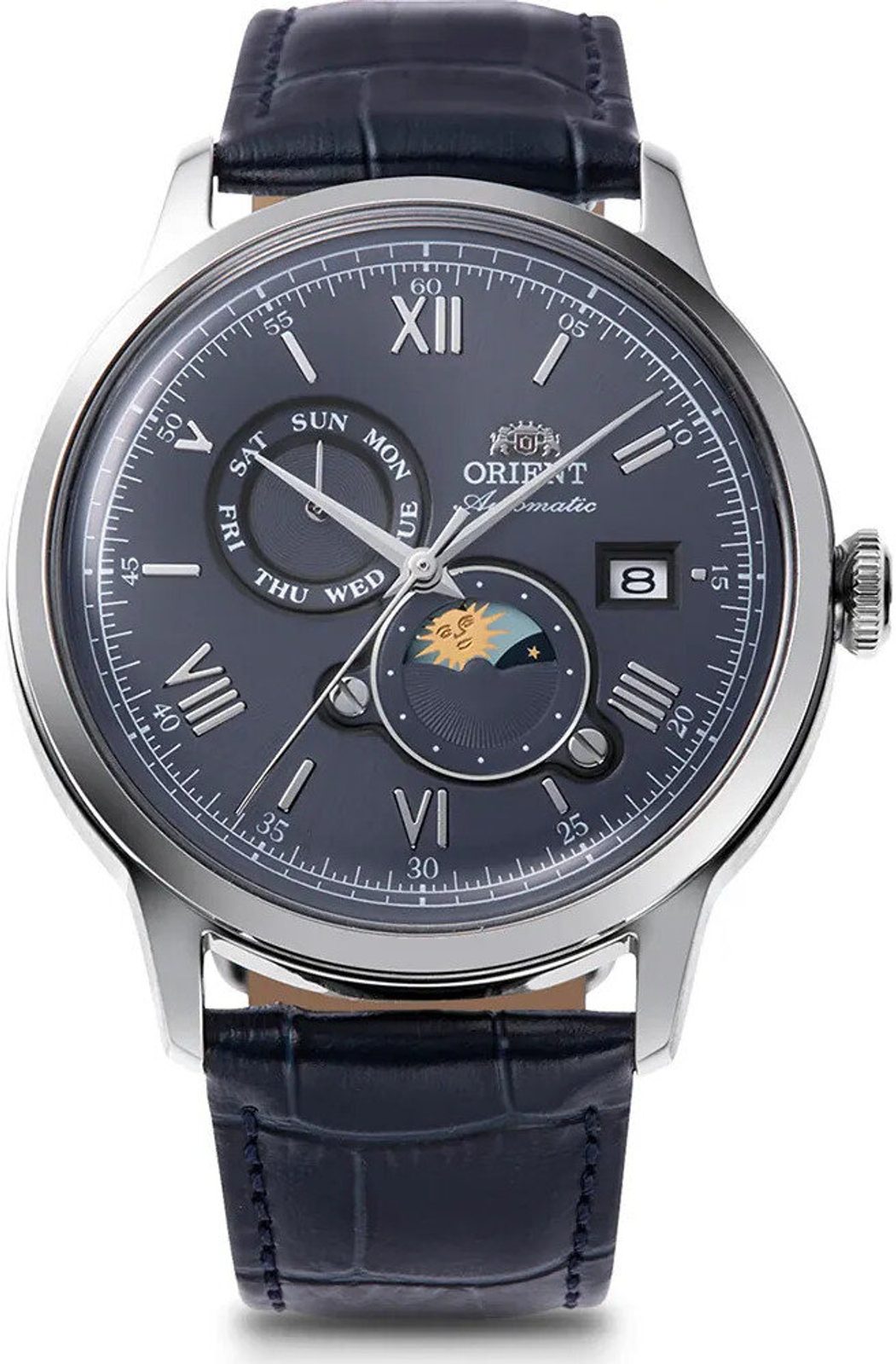 The Orient RA-AK0806L Sun and Moon watch is known as the Orient Bambino, belongs to the Orient Classic series and its elegant look is designed primarily for company, but it is also great for everyday wear. The distinctive features of the Orient Bambino are the domed glass, curved dial and 41.5mm case.