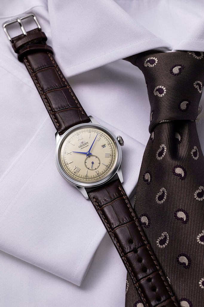 The hallmarks of the Orient Bambino are the domed glass, curved dial and overall simple lines and classic look. The ivory dial with a retro touch is appreciated for its good clarity, protected by a mineral crystal. The dial delights with details in the form of a subtle sunburst finish, embossed indices at the hour positions, or blue dauphine hands. The watch features a date display at the 3 o'clock position and an off-centre seconds hand in the sub-dial at the 6 o'clock position. The water resistance of this model is 30 m, so the watch can withstand contact with water during hand washing and rain. The steel case is complemented by a brown leather strap with a crocodile pattern. The 38.4 mm case diameter makes the watch a great choice for a suit and will also suit smaller wrists.