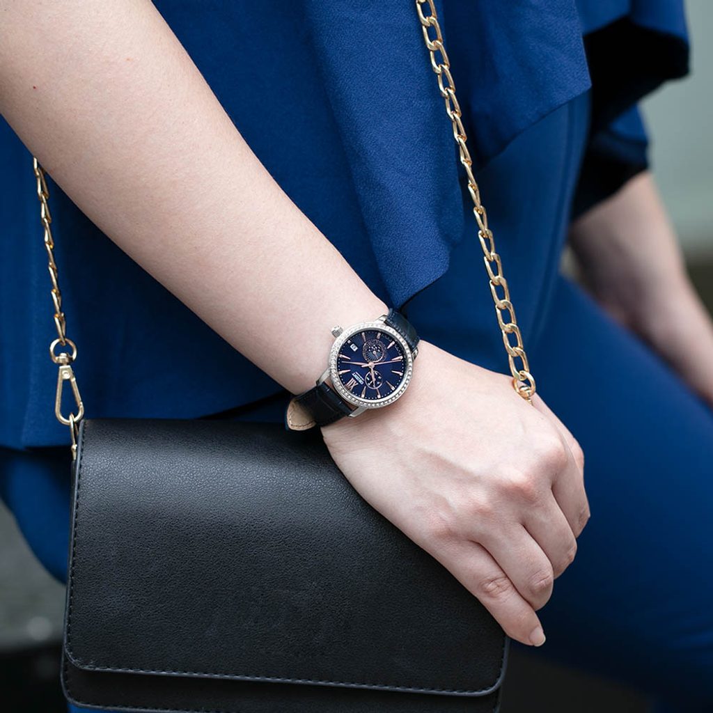 The blue dial is decorated with rhinestones in the 24-hour sub-dial at the 5 o'clock position. The stones also form the hour indexes, and the 12 o'clock position is set with Roman numerals. The poetic dial is protected by a mineral glass. A lunette set with crystals and a decorative crown with a rhinestone are unmistakable elements next to the dial. The overall impression is completed by the delicate leaf hands and the graceful shape of the case. The watch offers a date function at the 3 o'clock position and a day sub-dial at 10 o'clock. The heart of the watch is the Orient F6B22 mechanical movement with automatic winding and a power reserve of around 40 hours. The movement can also be monitored with a sight glass. The elegance of the watch is enhanced by the supplied leather strap with a crocodile pattern. The watch has a water resistance of 30 m, so it can withstand accidental contact with water during hand washing and rain.