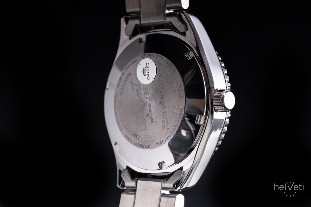 The caseback also bears a special marking with the inscription "Orient Since 1950 75th Anniversary" and the serial number of the limited edition.
