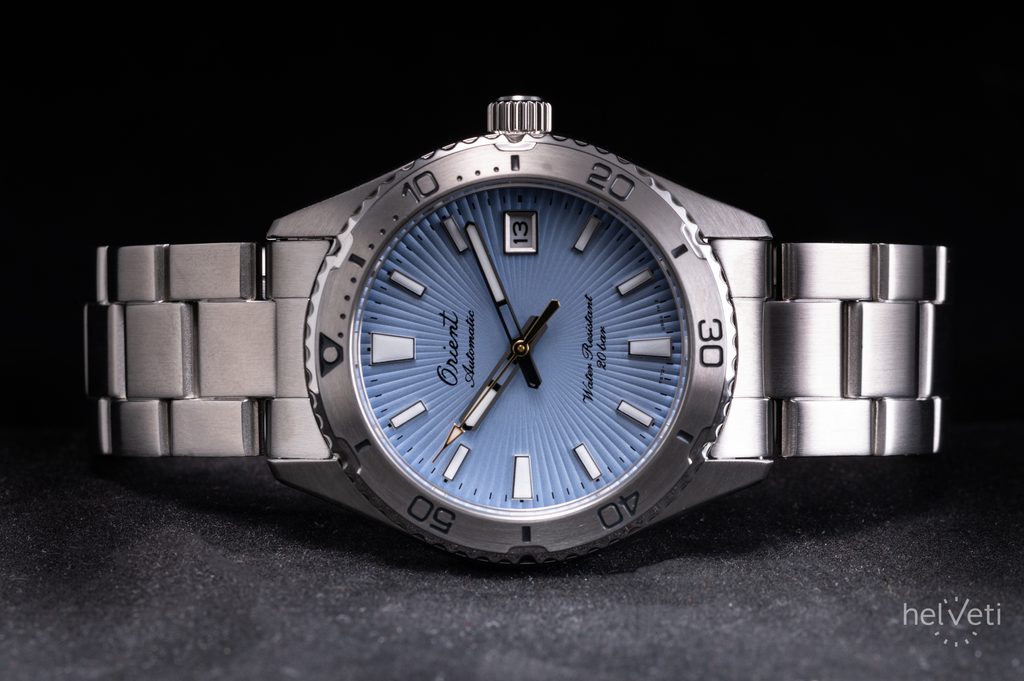 A nice detail of the watch is the golden seconds hand as a warm ray of sunlight, or the Orient logo from the 1950s, written in cursive.