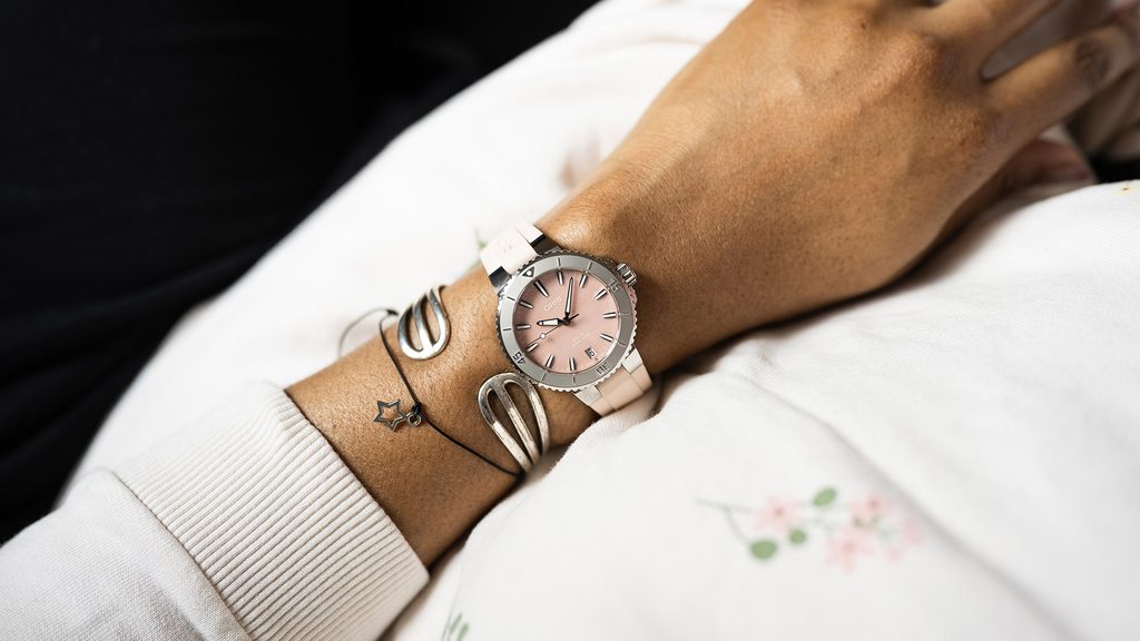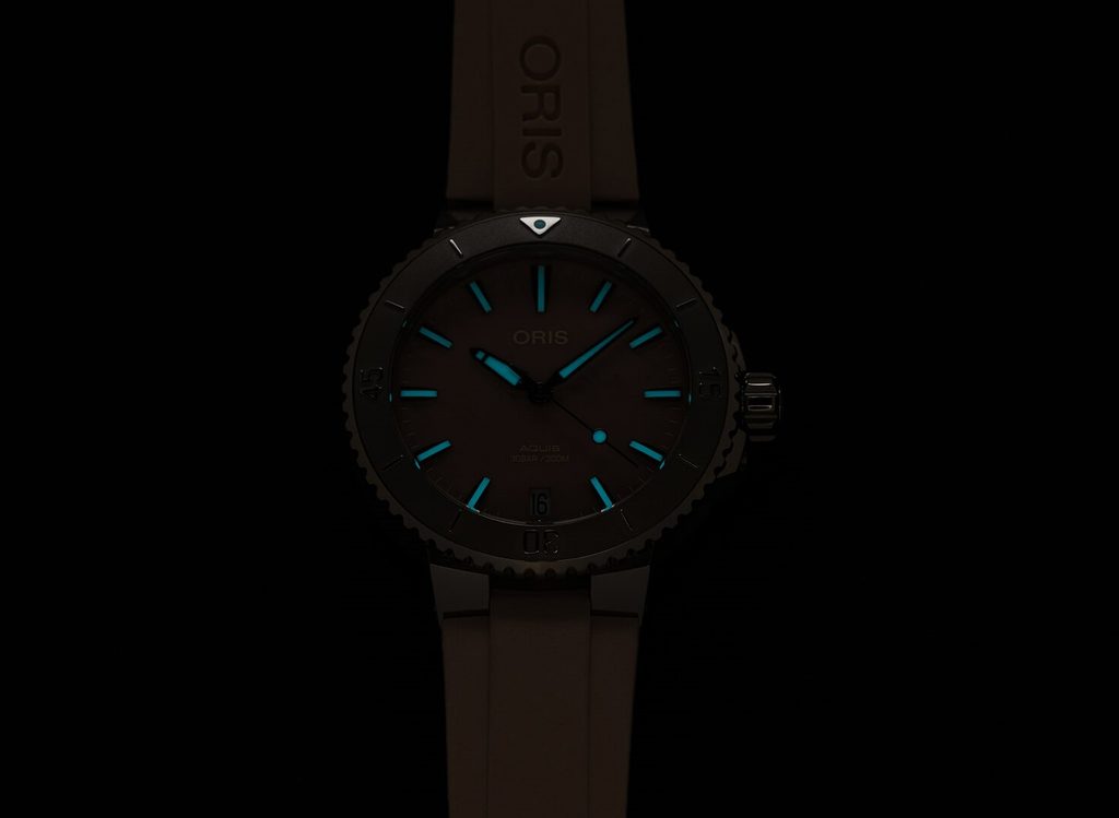 The perfectly clear mother-of-pearl dial is protected by a domed sapphire crystal that is maximally scratch-resistant. Legibility in sharp light is ensured by an internal anti-reflective coating. In the dark and in low light conditions, the Superluminova luminescence on the hands and indexes is at your service. The water resistance of this watch is 300 m ( 30 ATM), so it can handle contact with water, such as diving to about 30 meters. The water resistance is supported by a screw-down crown.