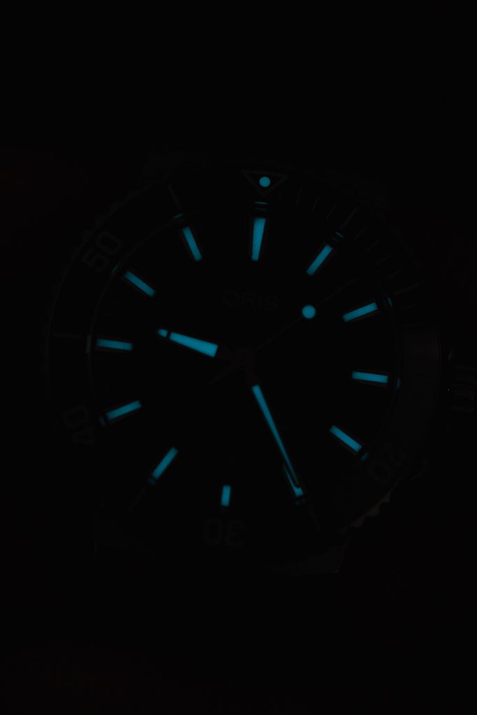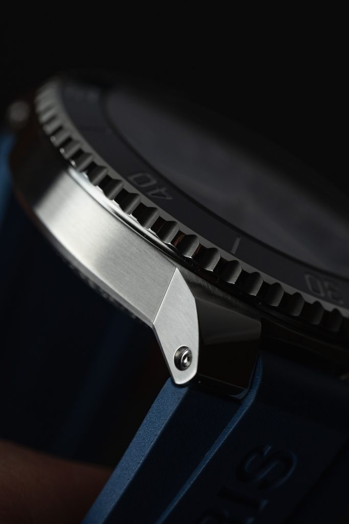 The perfectly clear dial is protected by a domed sapphire crystal that is maximally scratch-resistant. Legibility in sharp light is then ensured by an internal anti-reflective coating. In darkness and low light conditions, the luminescence of Superluminova on the hands and indexes is useful. The water resistance of this watch is 300 m ( 30 ATM), so it can handle contact with water, such as diving to about 30 meters. The water resistance is supported by a screw-down crown.