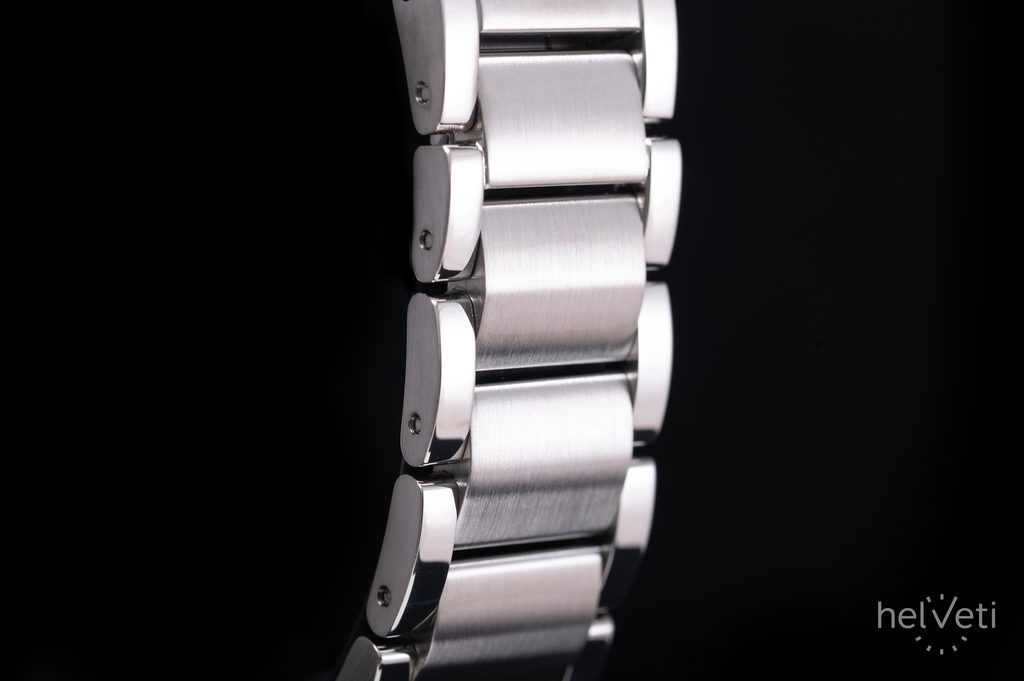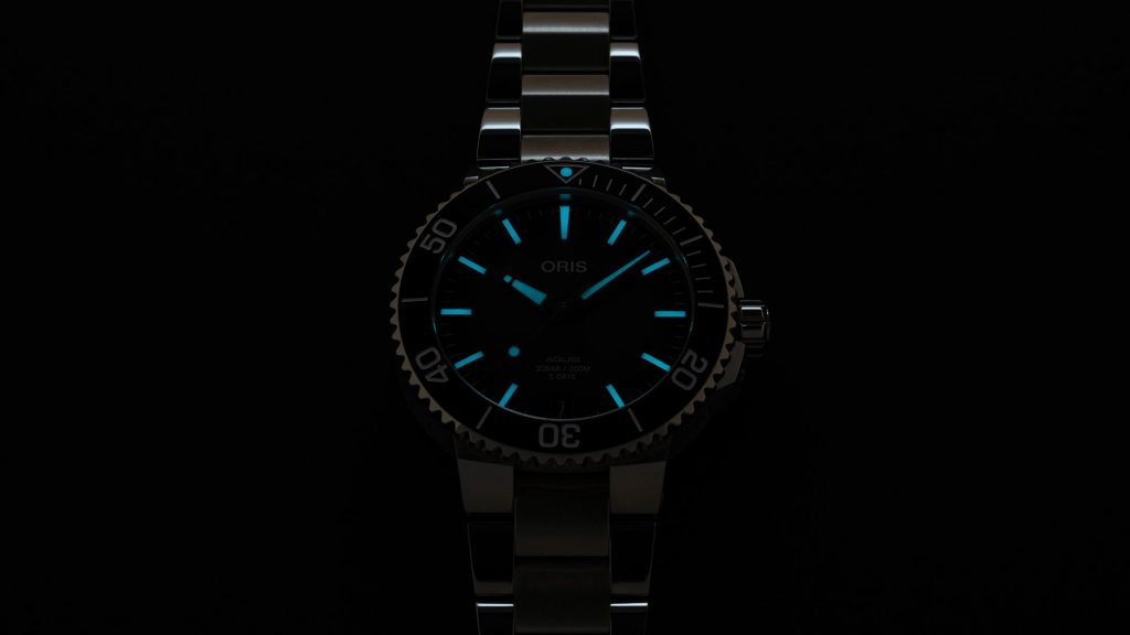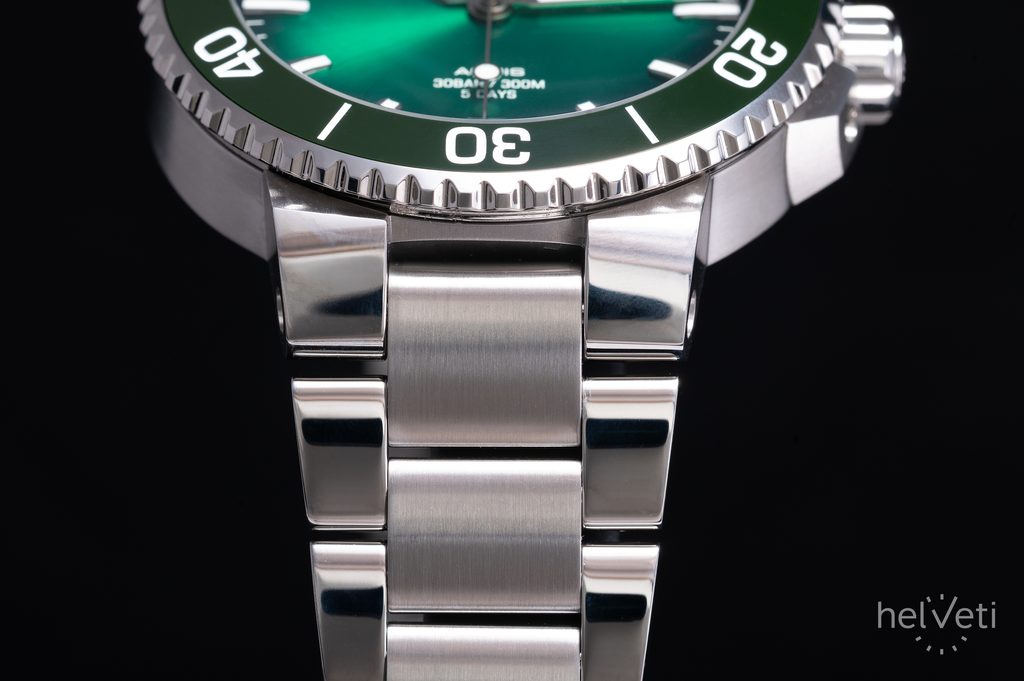 The perfectly clear dial is protected by a domed sapphire crystal that is maximally scratch-resistant. Legibility in sharp light is then ensured by an internal anti-reflective coating. In darkness and low light conditions, the luminescence of Superluminova on the hands and indexes is useful. The water resistance of this watch is 300 m ( 30 ATM), so it can handle contact with water, such as diving to about 30 meters. The water resistance is supported by a screw-down crown.