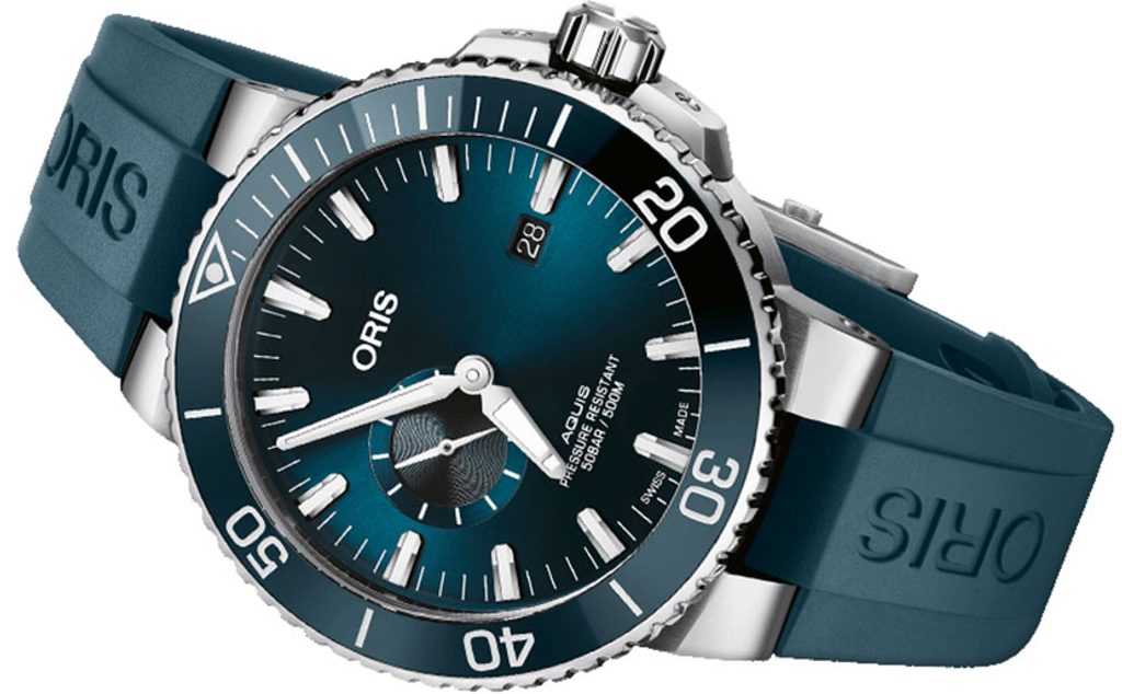 The case of the Oris Aquis Small Second Date 0174377334155-0742469EB is made of stainless steel and is complemented by a rubber strap. Inside, the Oris 743 Swiss mechanical movement (based on the Sellita SW220-1) with automatic winding works reliably. This movement has 26 stone fits inside and operates at a frequency of 28,800 semi-frequencies per hour (4 Hz). A handy date indicator is located at position 3 , and an off-centre seconds hand is found at position 9. A unidirectional rotating ceramic diving lunette is used to measure time periods.
