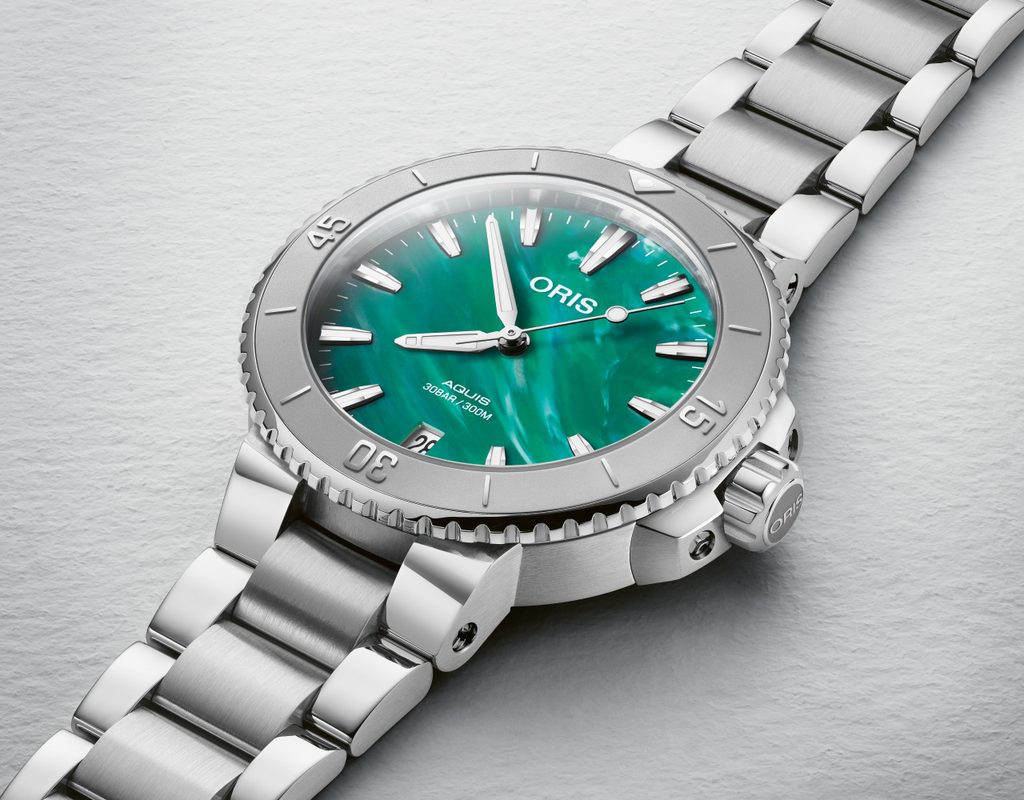 The Swiss Oris Aquis X Bracenet 36.5 mm 01 733 7770 4137-07 8 18 05P impresses with its specific, highly attractive "diver" design and excellent workmanship. This model serves you well not only underwater, but also in everyday wear. This special edition is dedicated to Bracenet, an organisation dedicated to the production of various items made from fishing nets fished from the ocean. It turns life-threatening waste into something beautiful.