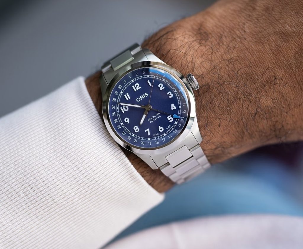 The Swiss Oris Big Crown Pointer Date 01 754 7798 4068-07 8 20 06 impresses with its attractive retro pilot style and excellent workmanship. This model serves excellently not only in the clouds, but also in everyday wear.