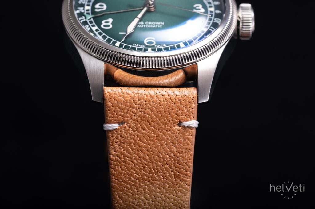 The perfectly clear dial, rendered in a retro pilot style, is protected by an arched sapphire crystal that is maximally scratch-resistant. An internal anti-reflective coating ensures legibility in bright light. In darkness and low light conditions, the Superluminova luminescence on the hands and indices is at your service. The water resistance of this watch is 50 m ( 5 ATM), so it can also handle contact with water, such as a shower or rain. The water resistance is supported by a screw-down crown.