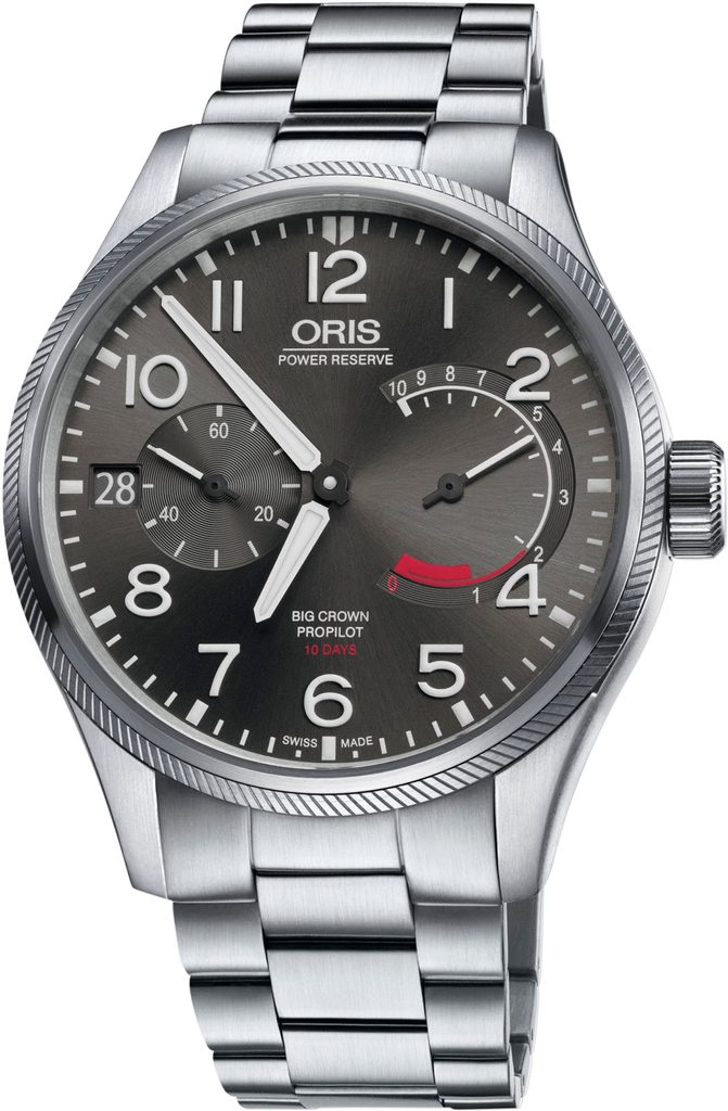 The case of the Oris Big Crown ProPilot Calibre 111 0111177114163-Set82219 is made of stainless steel, as is its bracelet. The lunette is decorated with the typical scalloping that symbolizes the turbine of an aircraft engine. Inside the case, the Oris Calibre 111 Swiss mechanical movement with manual winding works reliably, which was developed and manufactured by Oris - so it is an in-house manufacture movement. This beautifully ornate movement has 40 stone settings, runs at a frequency of 21,600 semi-frequencies per hour (3 Hz) and can be observed thanks to its transparent sapphire crystal dial. The Oris Calibre 111's greatest strength is its high power reserve of 240 hours, a respectable 10 days. You can see the current power reserve on the non-linear power reserve indicator at the 3 o'clock position. At the 9 o'clock position, there is an off-centre seconds hand as well as a handy date display.