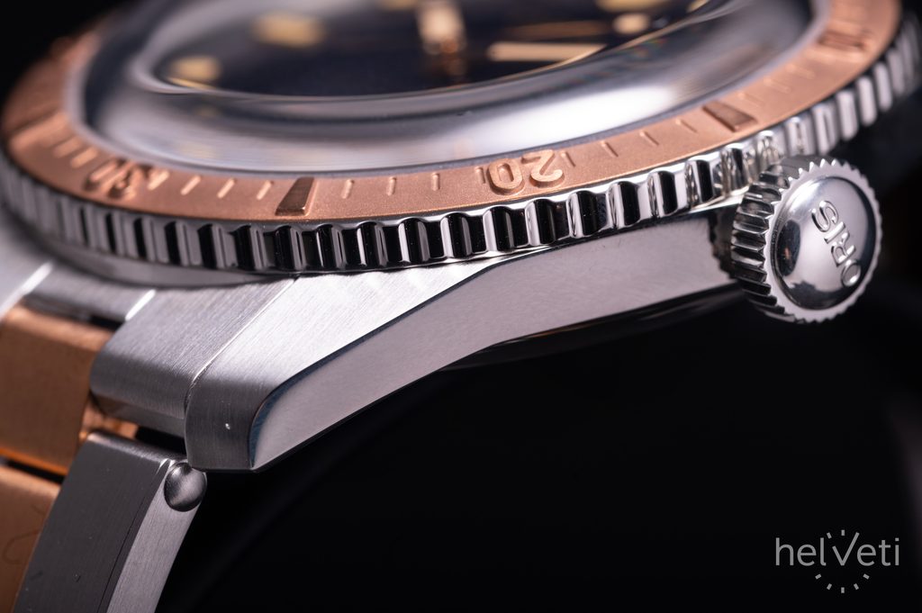 The Swiss Oris Divers Sixty-Five 01 733 7707 4355-07 8 20 17 watch impresses with its retro "diver" design and excellent workmanship. This model will serve you well not only in the water, but also in everyday wear. The bronze parts of the case bring patination during wear, making each piece unique.